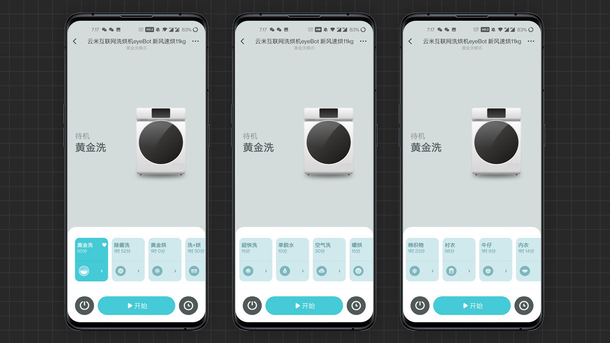 进入到设备管理界面,UI设计倾向于简约风,配色方面也是云米VI色系。上面大半部分以洗衣机图标的形式标示设备当前的工作状态;下半部分操作区域排布有洗衣机的多种工作模式,除了机身UI中自带的几个模式之外,还有其他模式可供选择,总共有21种模式。