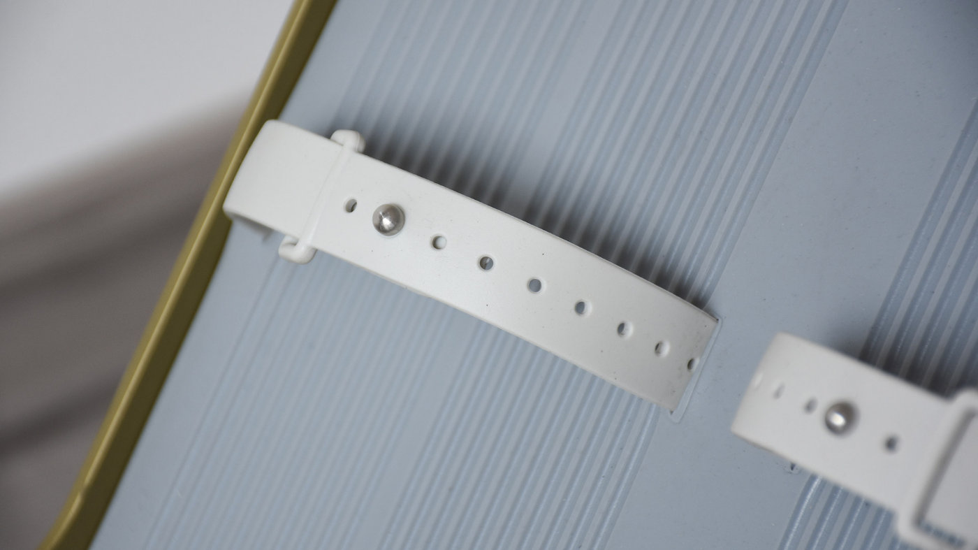 在机身前端以及后方轨道底部设计有灰色的橡胶支撑垫,避免机身底部与地面产生摩擦相互损伤。机身头部下方还有两个橡胶滚轮,日常需要移动的时候,手握住后方的凹槽把手微微拎起,依靠前面的滚轮就可以拖着走,比较方便。