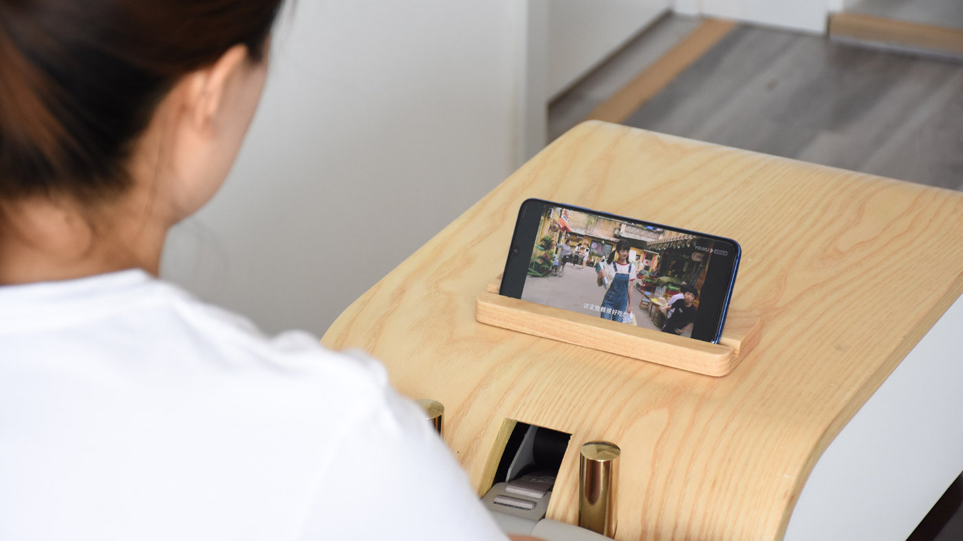 水箱部分上方设计有木质的手机平板支架,日常可以把手机或者平板电脑放上去,根据APP中的教程进行锻炼,或者是在锻炼的同时看看看电影煲剧。