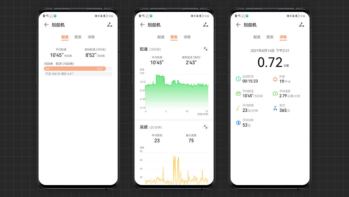运动过程中,华为健康APP会自动统计公里数、运动时间和频次,通过算法计算热量消耗及功率数据并推送给用户;滑动到第二页还支持以折线图的形式显示配速和桨频状态,直观的将运动数据推送给用户。同时,系统也会自动检测划船机的工作状态,以语音的形式提醒用户。