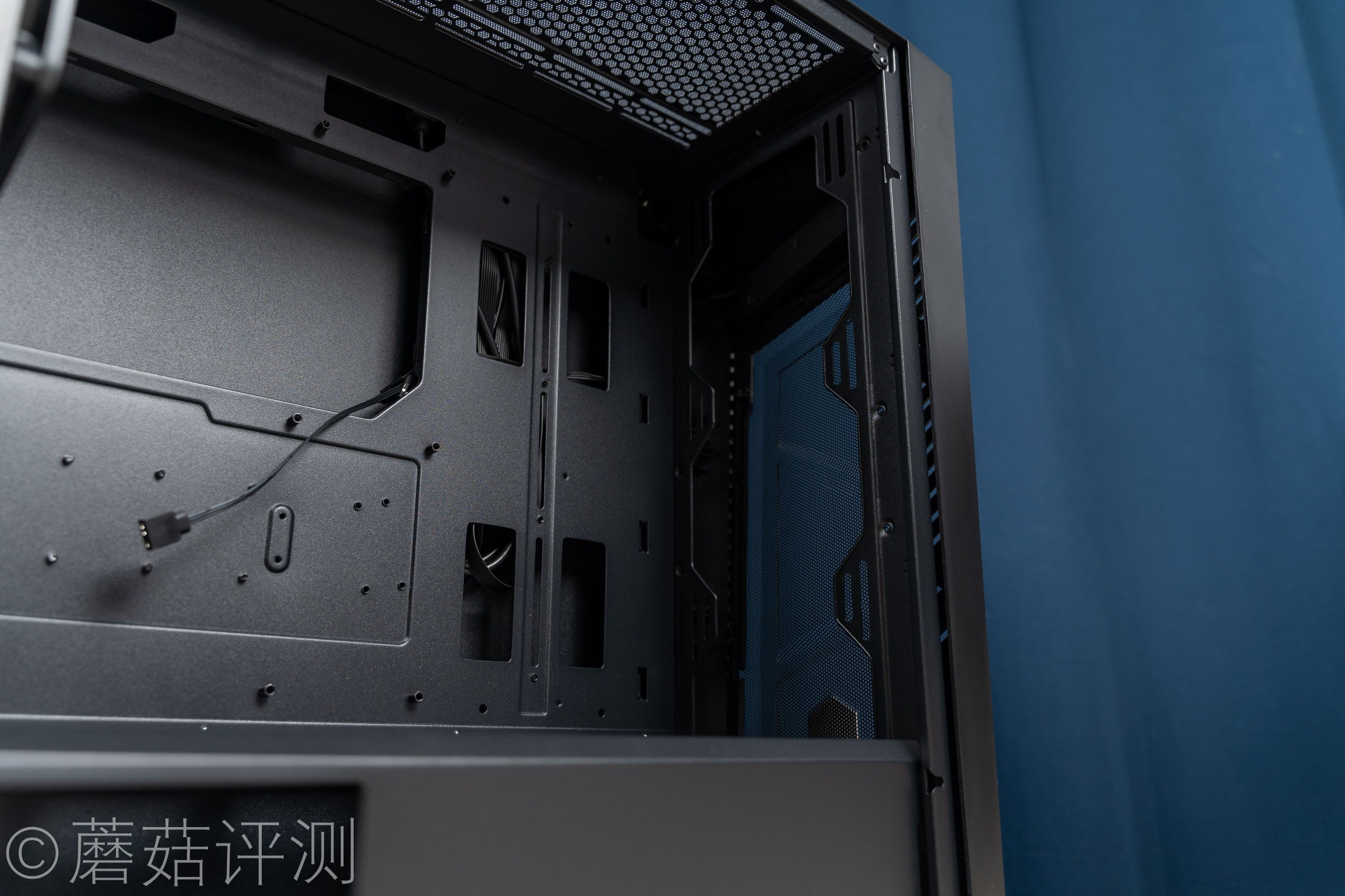 ▼机箱后部标配一把120mm规格的机箱风扇,顶部可以固定360冷排,主板固定位四周有多个开孔,方便走线。