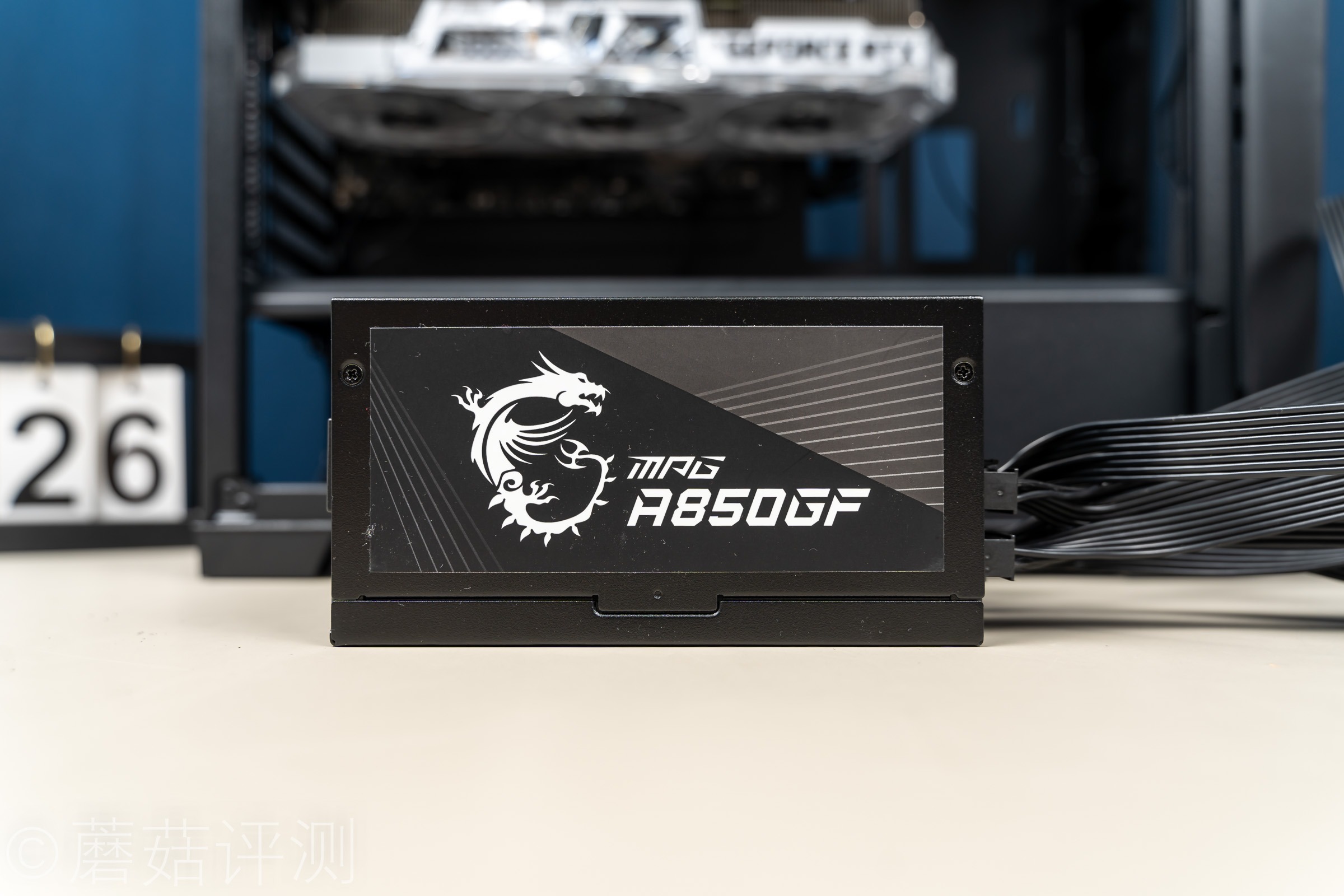 ▼接着固定电源,微星的MPG A850GF,这款电源还是很不错的,全日系电容,10年保修,就连侧面的标签都很好看,有微星的龙盾LOGO。