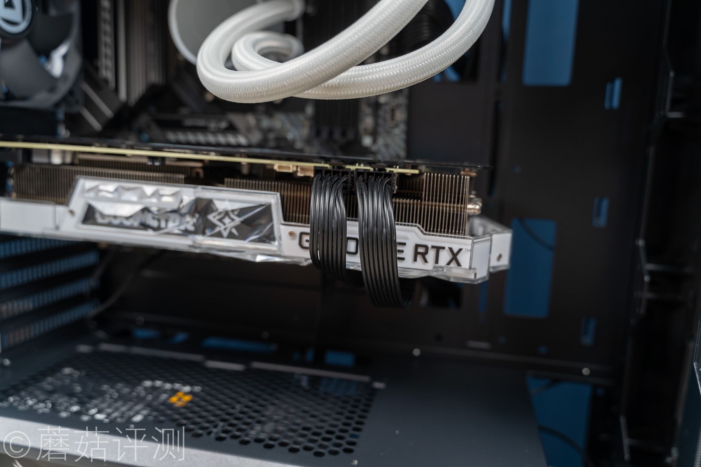 ▼显卡直接横置安装,机箱的内部空间还是非常充足的,安装这种三风扇的长显卡,显卡的尾部依然有很多空间,再塞个360冷排啥的,也没问题。