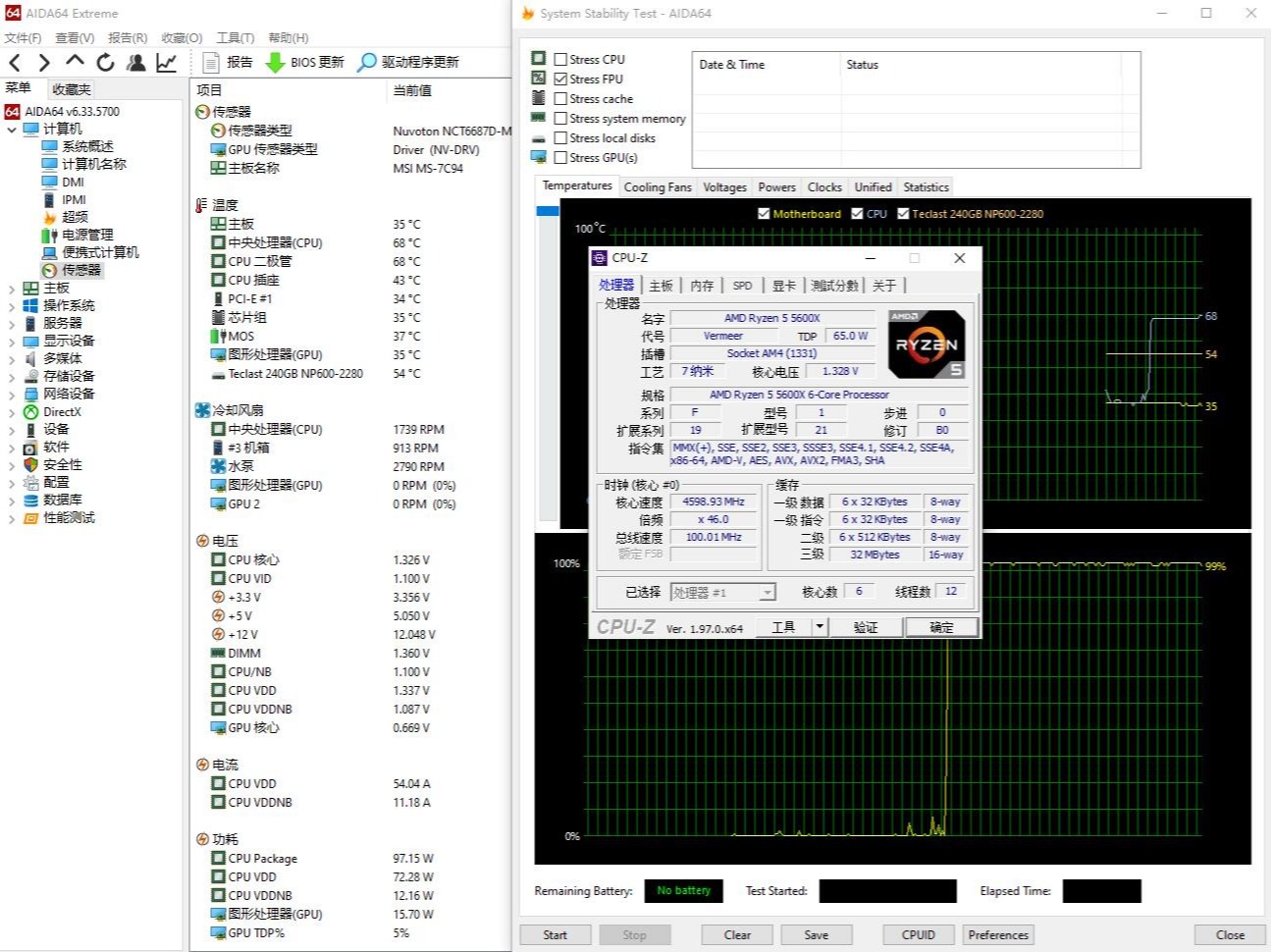▼简单跑个CPU-Z的压力测试,处理器的温度稳定在68℃,功耗97W左右,显卡的核心温度降至35℃。机箱的风道还是不错的,前进风,后上排风。