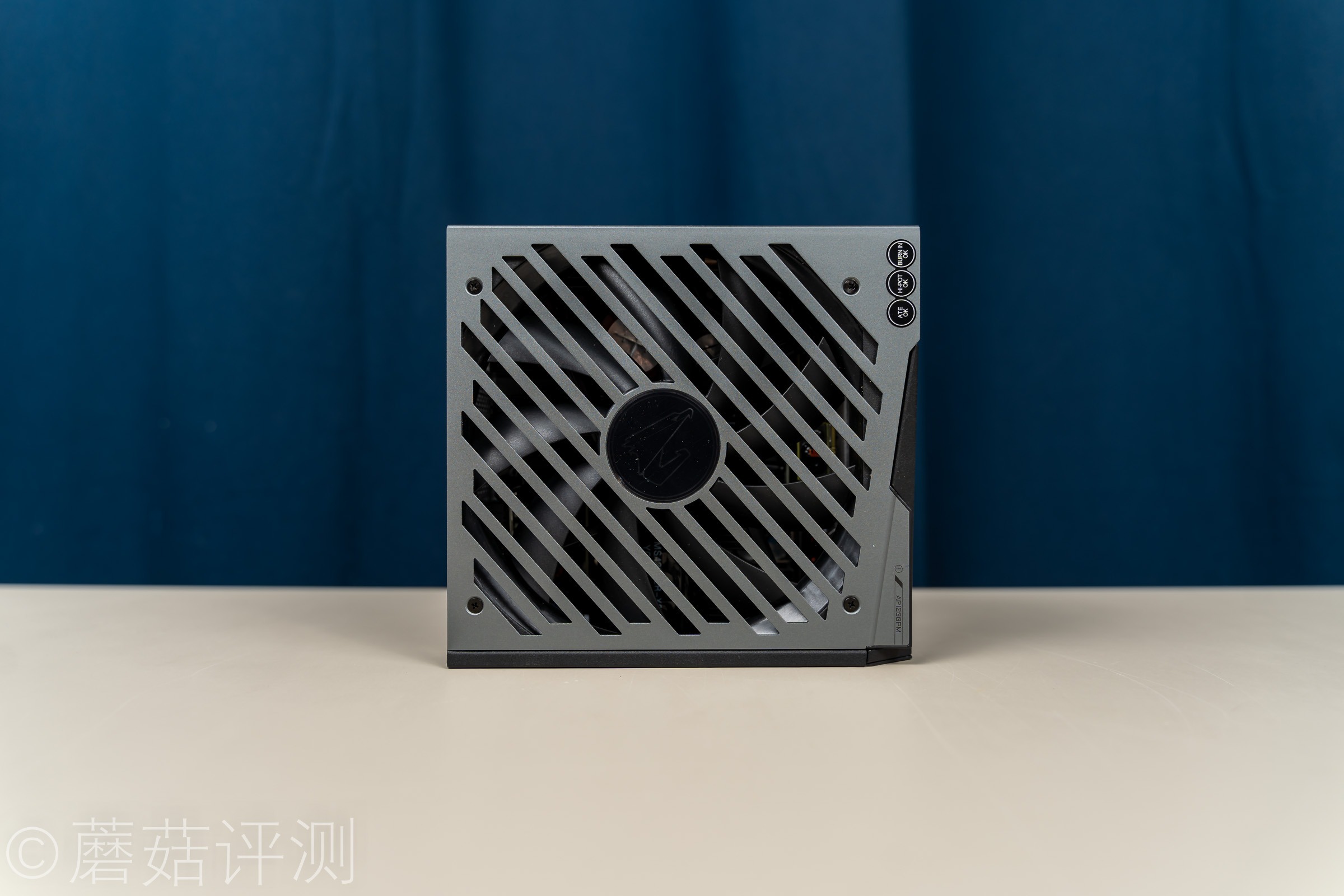 ▼电源的外观非常漂亮,侧面有斜条纹的格栅,中间有技嘉的大雕LOGO。并且这个格栅是灰色的,摸上去质感很不错,不知道是不是铝合金。