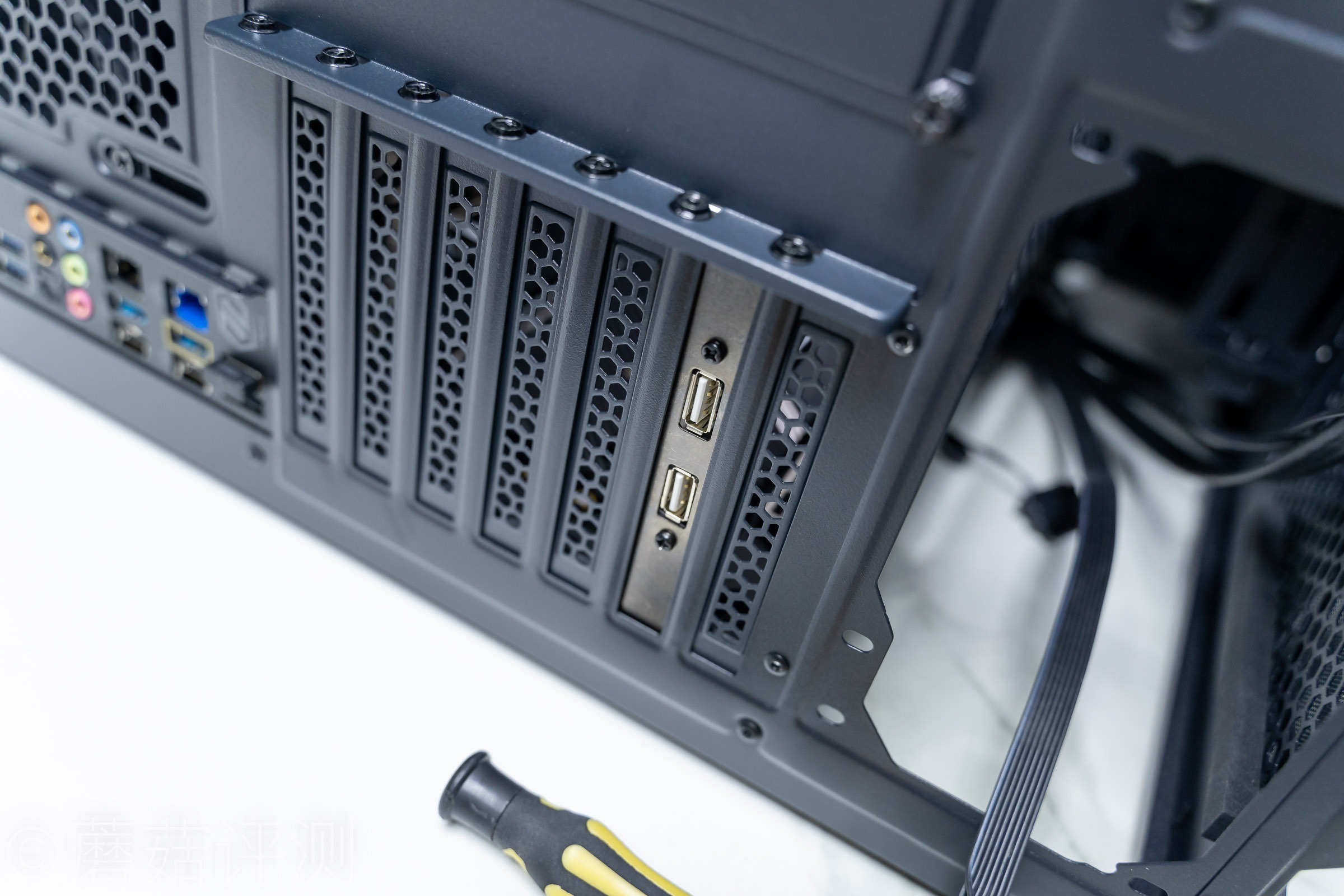 ▼机箱底部有七条横置的PCIe插槽,底部是电源仓。