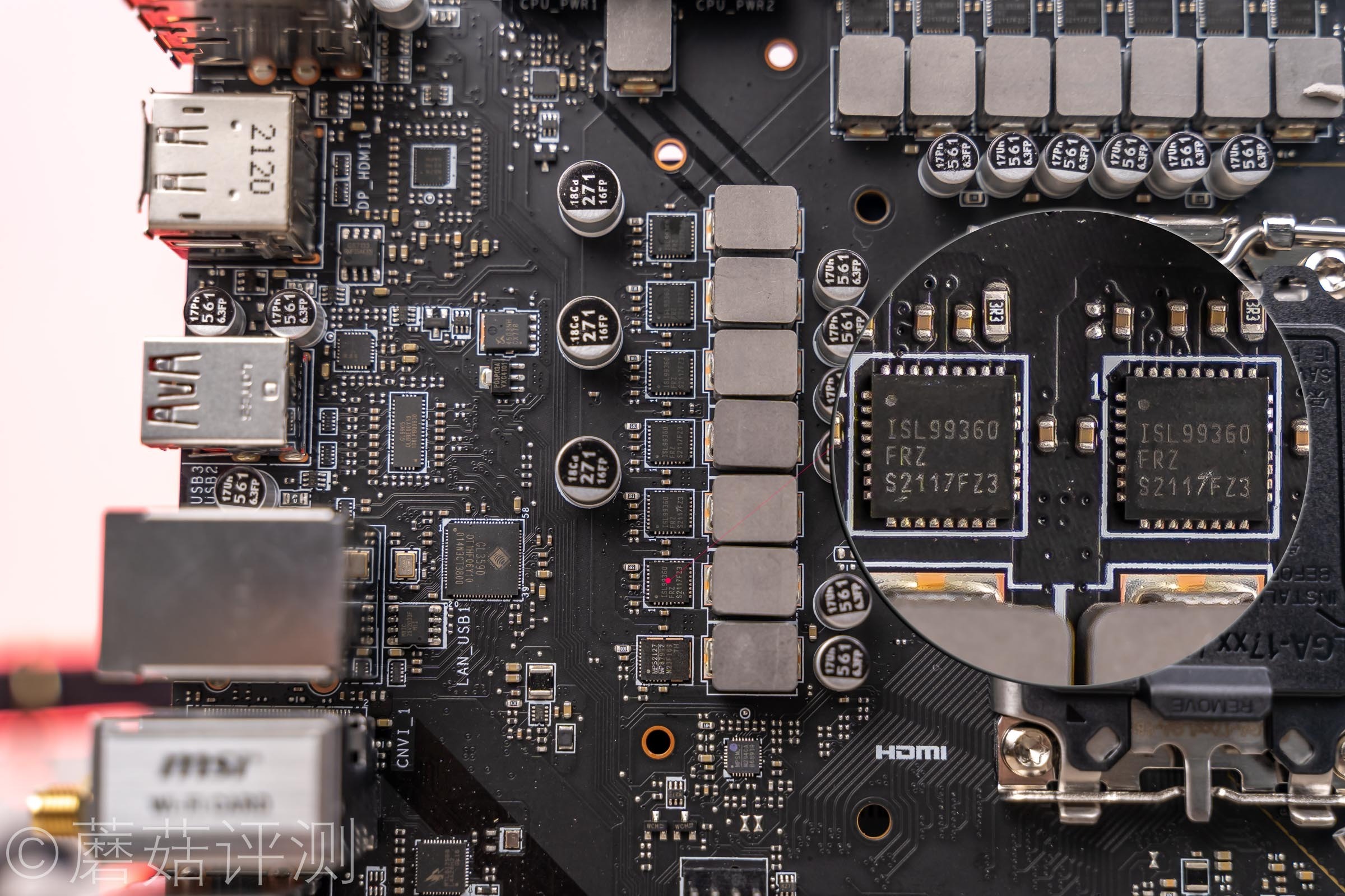 ▼主板上侧供电同样是7颗DrMos,丝印isl99360,最大稳定输出电流60A。另外,通过主板背面的布线可知,最右侧的一颗应该为核显供电。那么这块板子的供电规格就是Vcore供电6+6=12相,超级并联设计;Vgt供电1相,60A的DrMos;SOC供电一相,Converter供电。总共加起来就是12+1+1,整体的供电规格配置还是非常强大的!其中Vcore供电采用超级并联设计,一相PWM信号直接进两颗DrMos,这种供电设计,取消了倍相器,供电电路的响应会更高,应付突发的高负载会更加从容。另外,两颗DrMos负责一相供电,单路负载更低,运行温度更低,整体的供电电路的效率会更高、更稳定。对了,DrMos相比较于上下桥的Mos,其在内阻、体积和效率方面提升巨大。