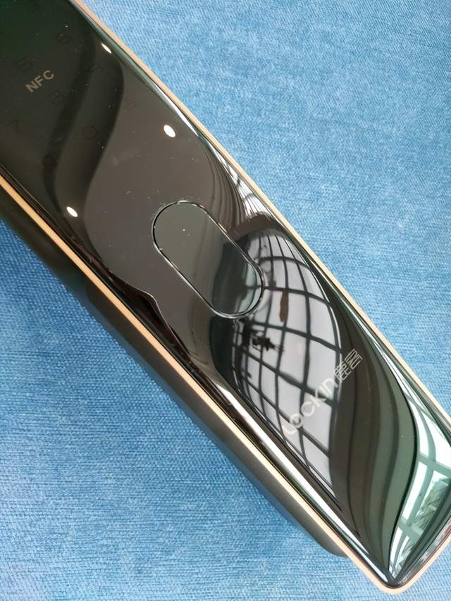 来单独看看门外的智能锁面板吧!铝合金材质,尺寸为419*76。四角做了磨圆设计,精工的感觉。