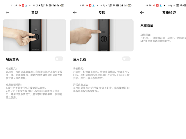 APP上会有各项功能的设置和使用说明,包括童锁的使用、反锁的使用、多重验证开门的使用等。