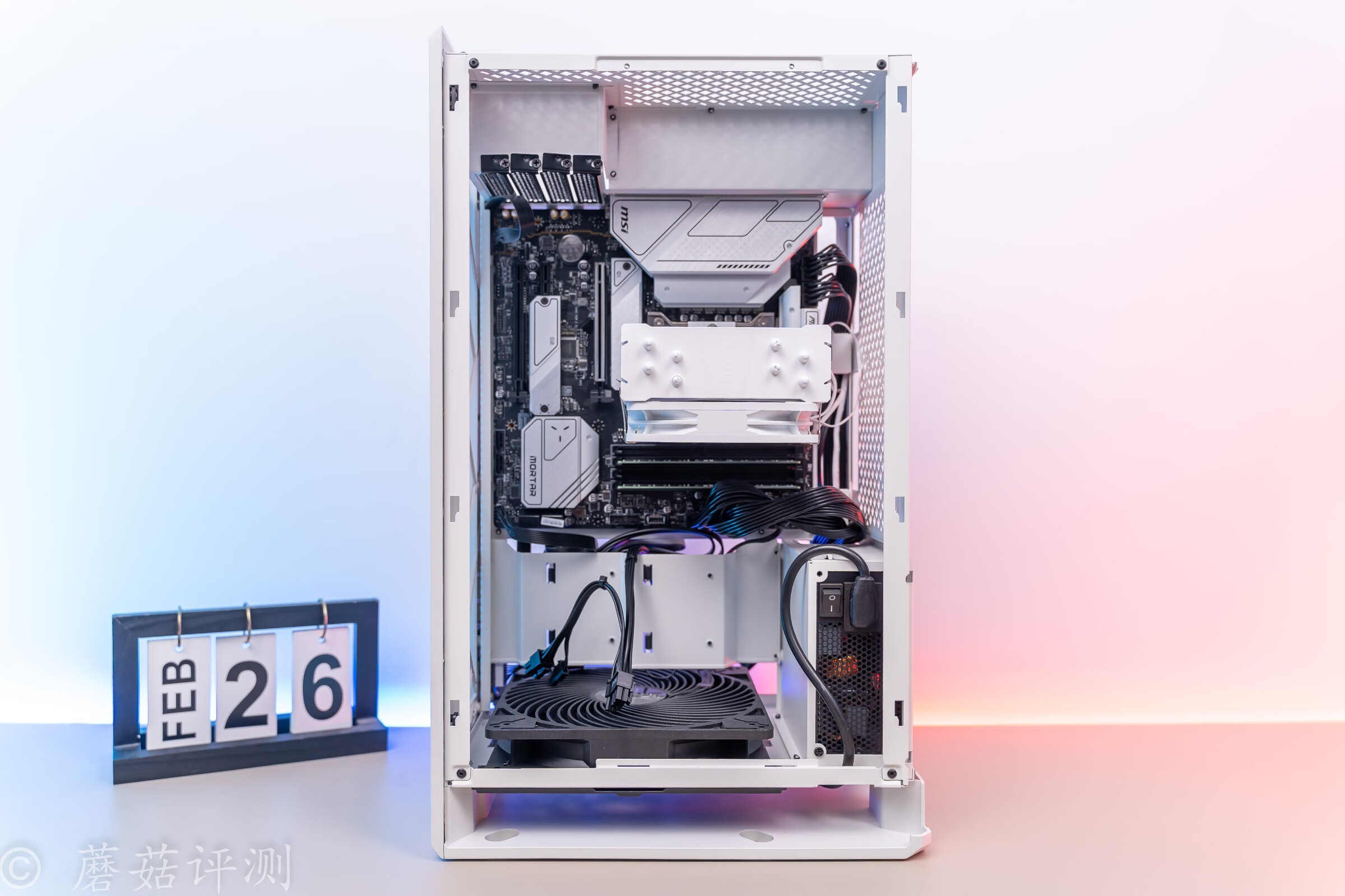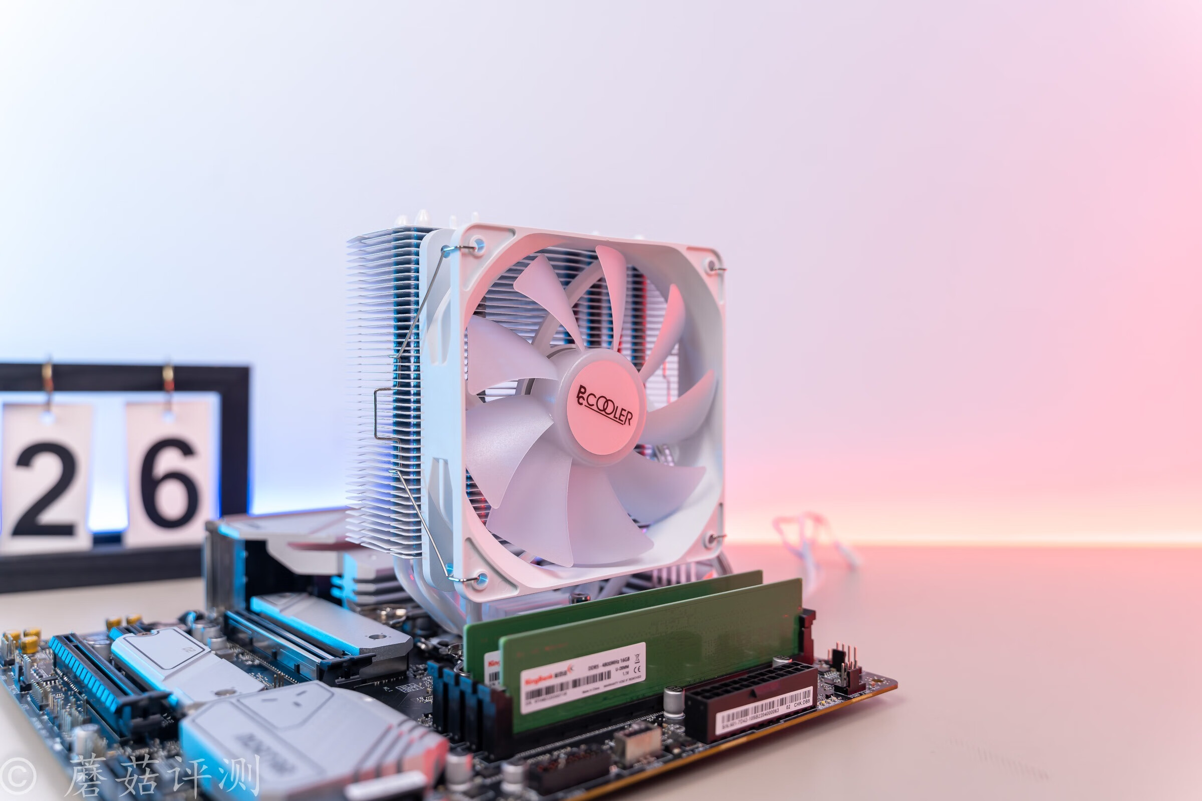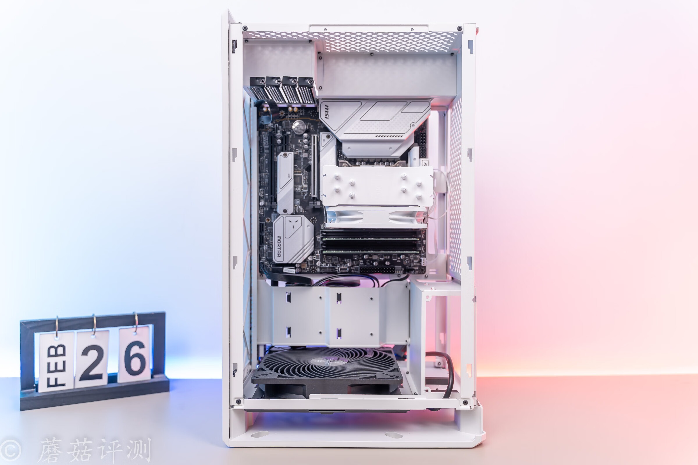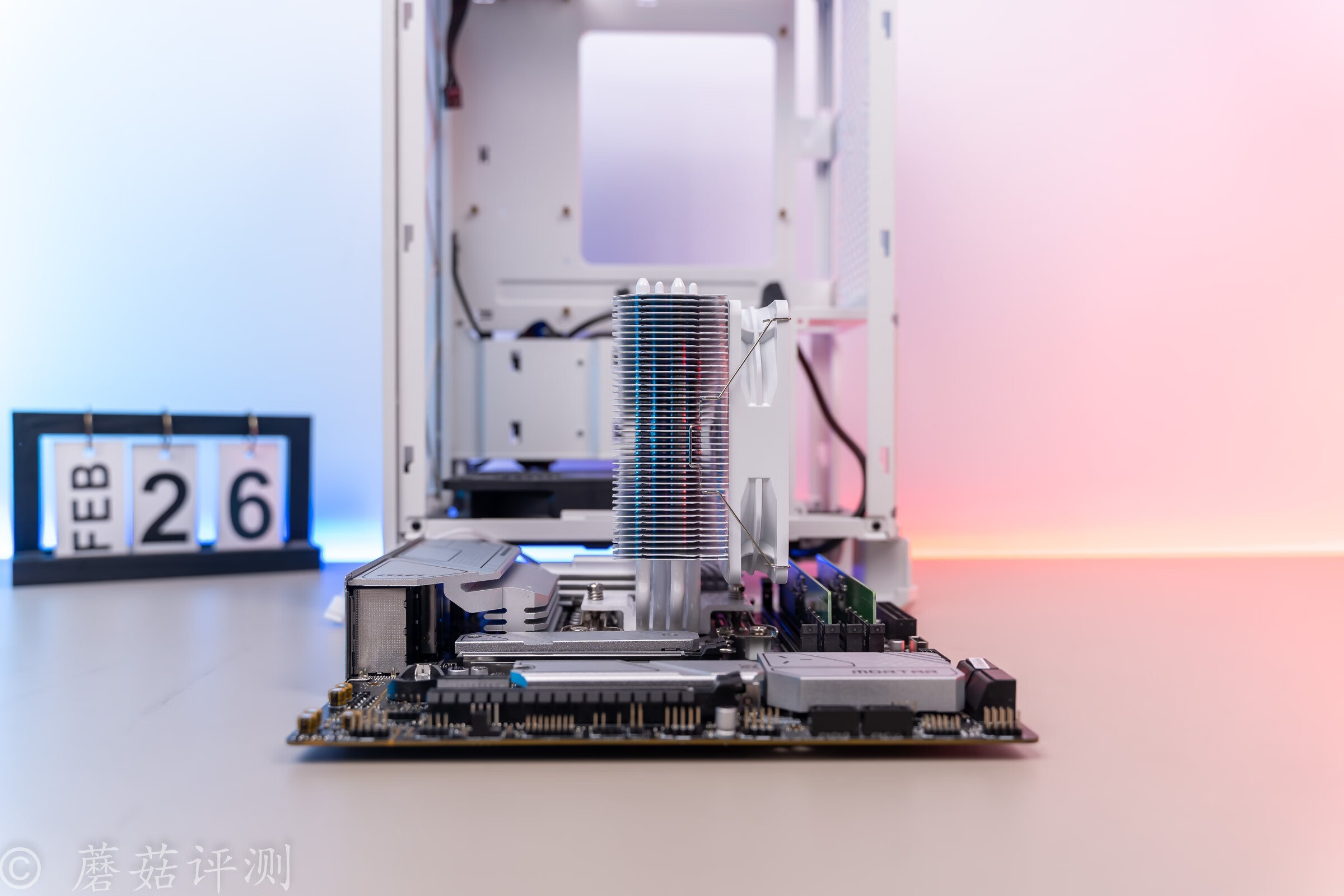 ▼主板右上固定,散热这里选择下进上出的风道,和机箱内部的垂直风道方向相同。