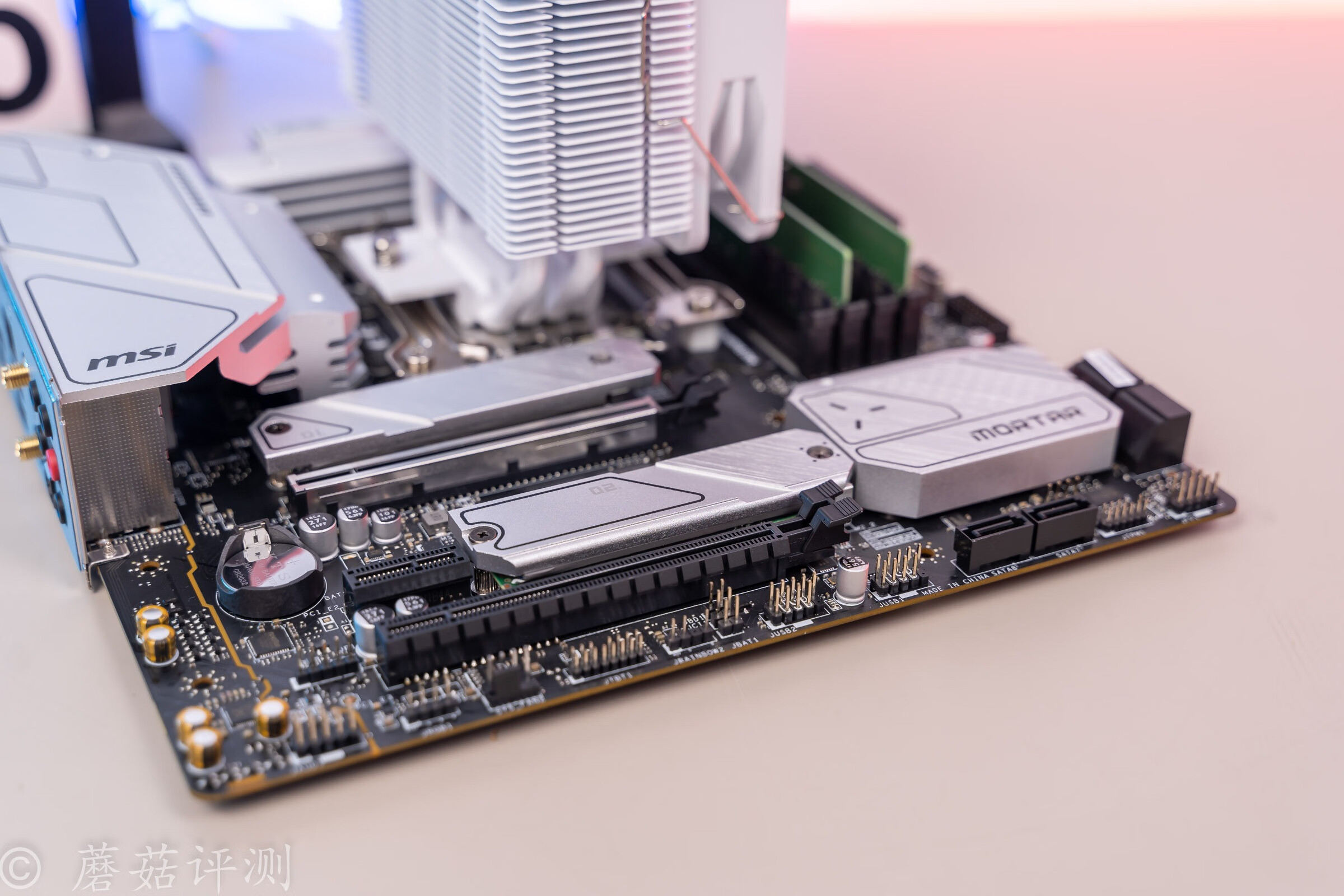 ▼微星B660M迫击炮Wifi主板的颜值挺漂亮的,主板正面有大面积的金属散热片,银白色的,非常漂亮。