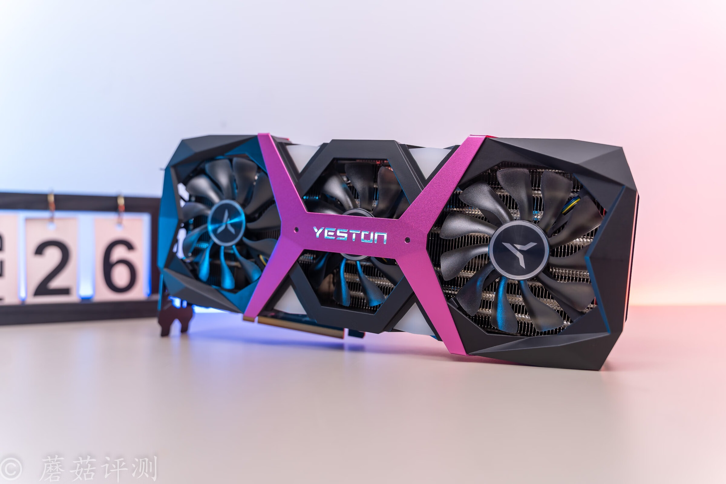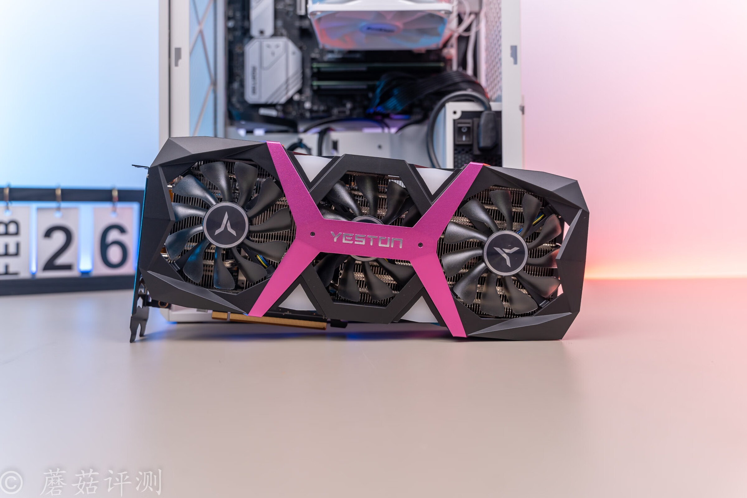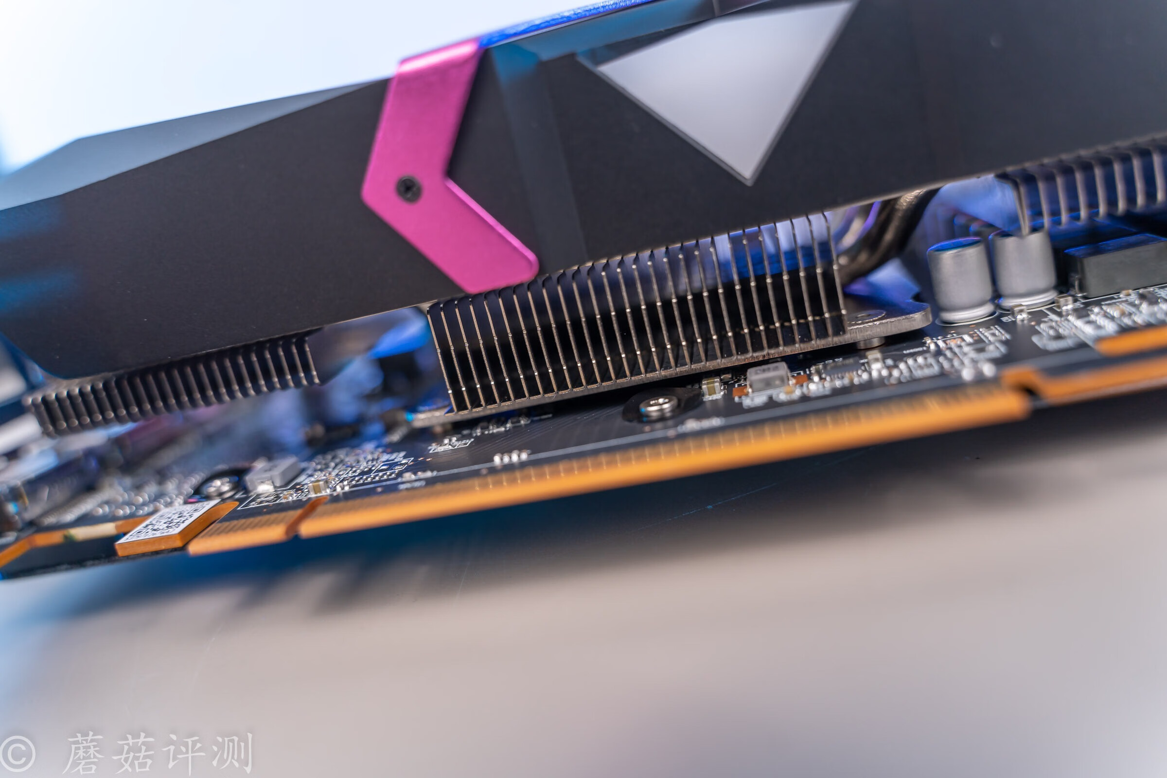 ▼显卡的风扇罩设计的非常骚气,中间是粉红色的金属加强件,下面是三把散热风扇。