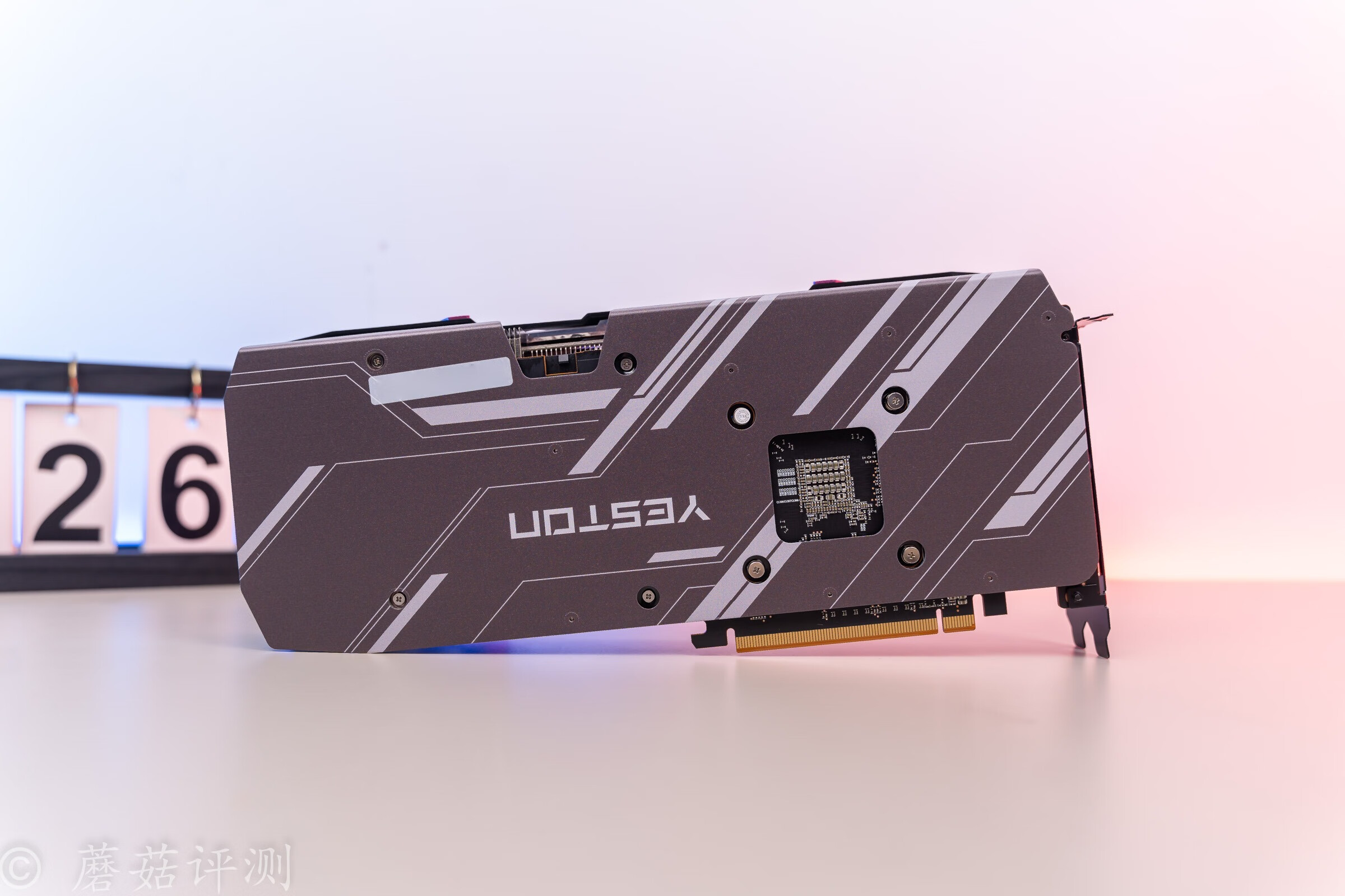 ▼显卡的背面是一整块金属背板,表面有漂亮的涂装,看着很舒服。