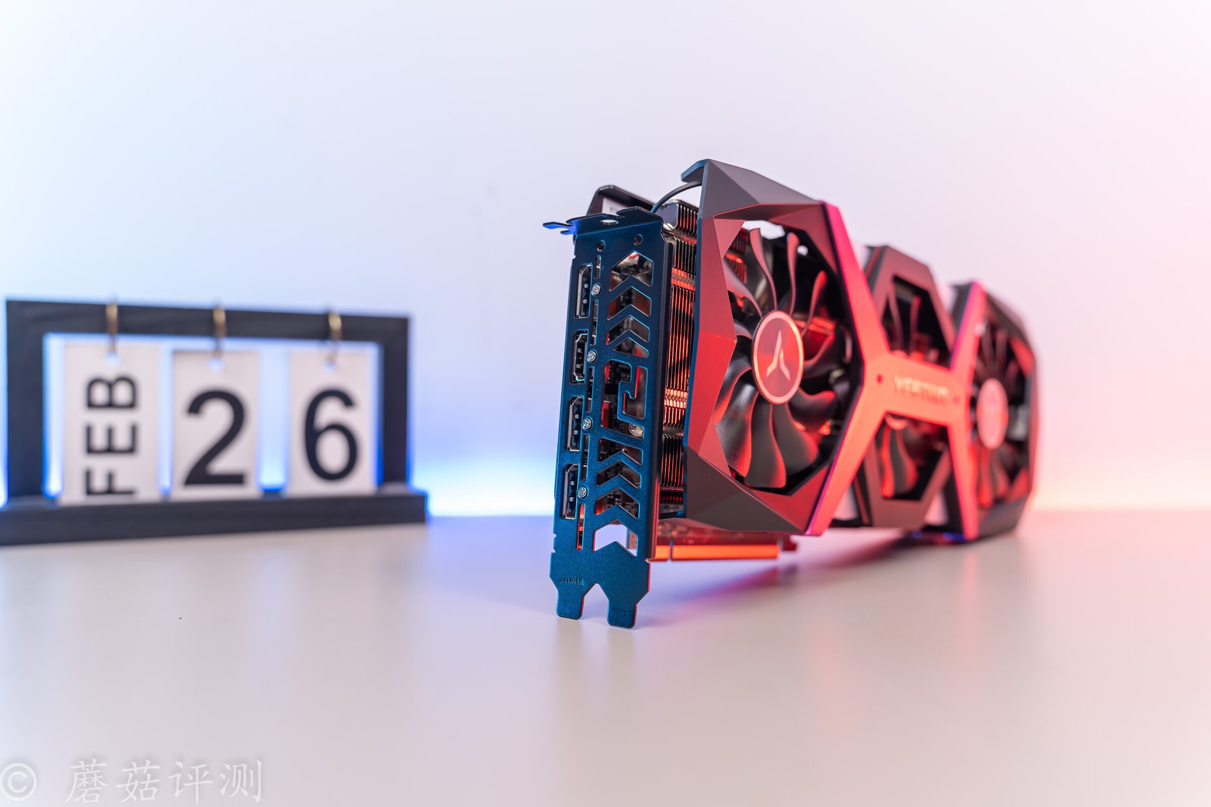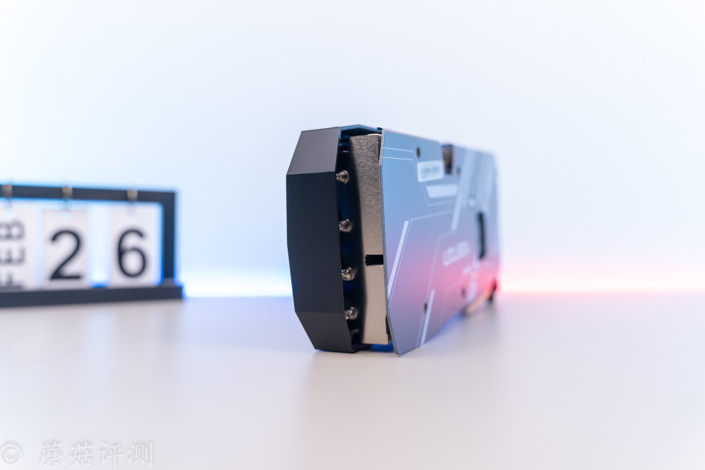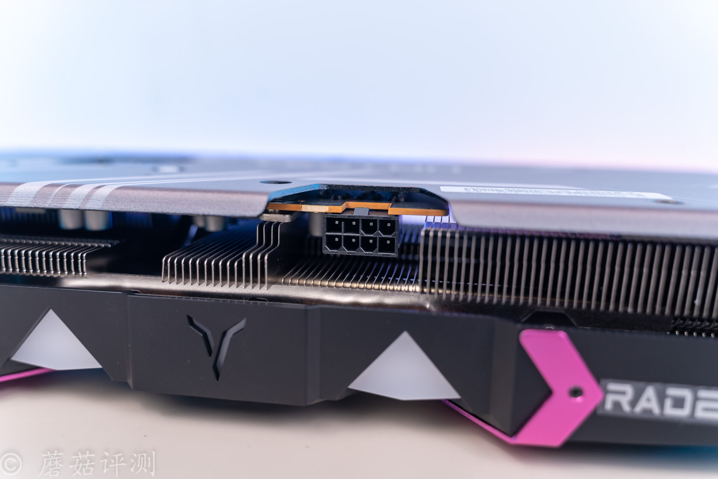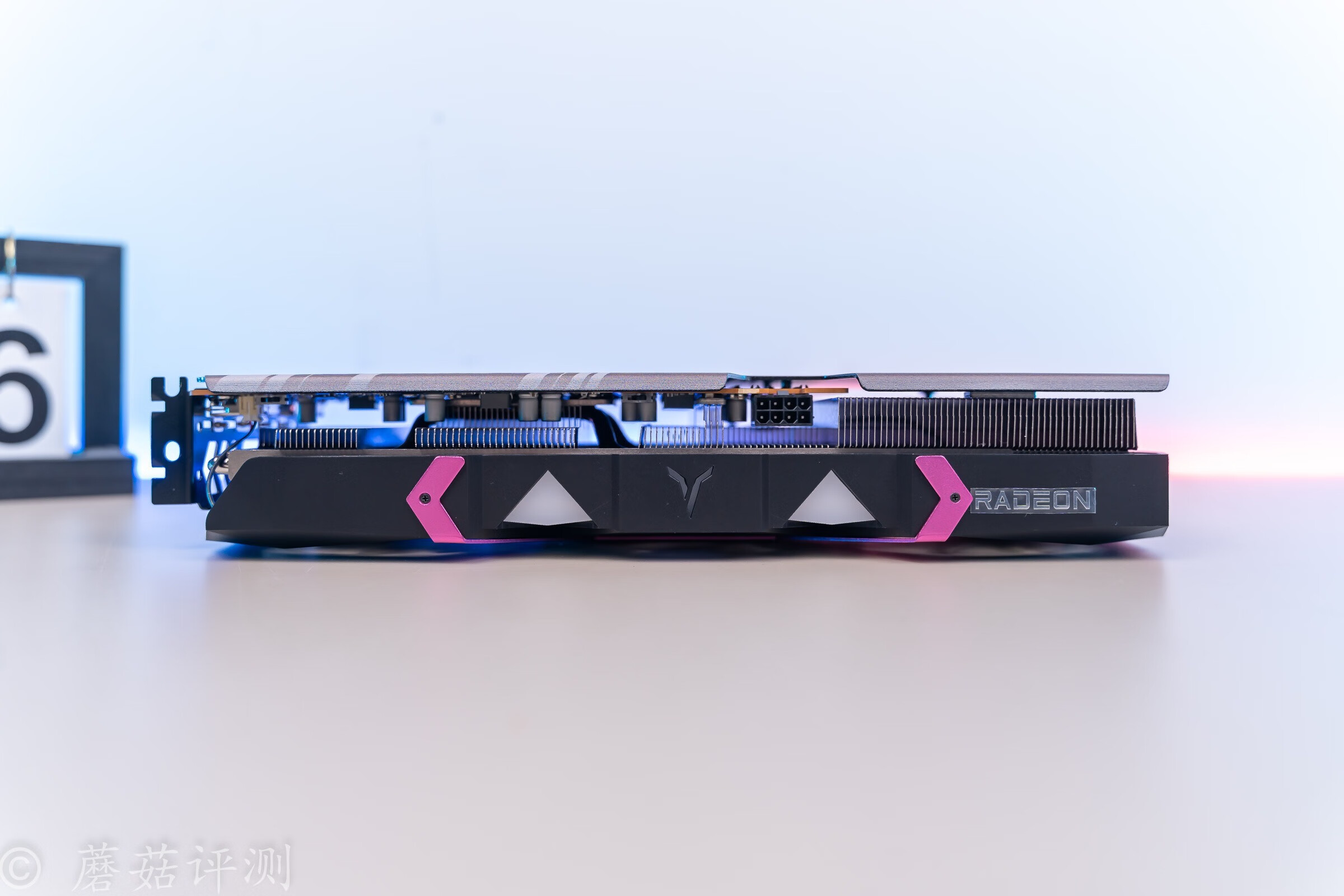 ▼显卡顶部,中间有灯效设计,右侧是熟悉的RADEON。