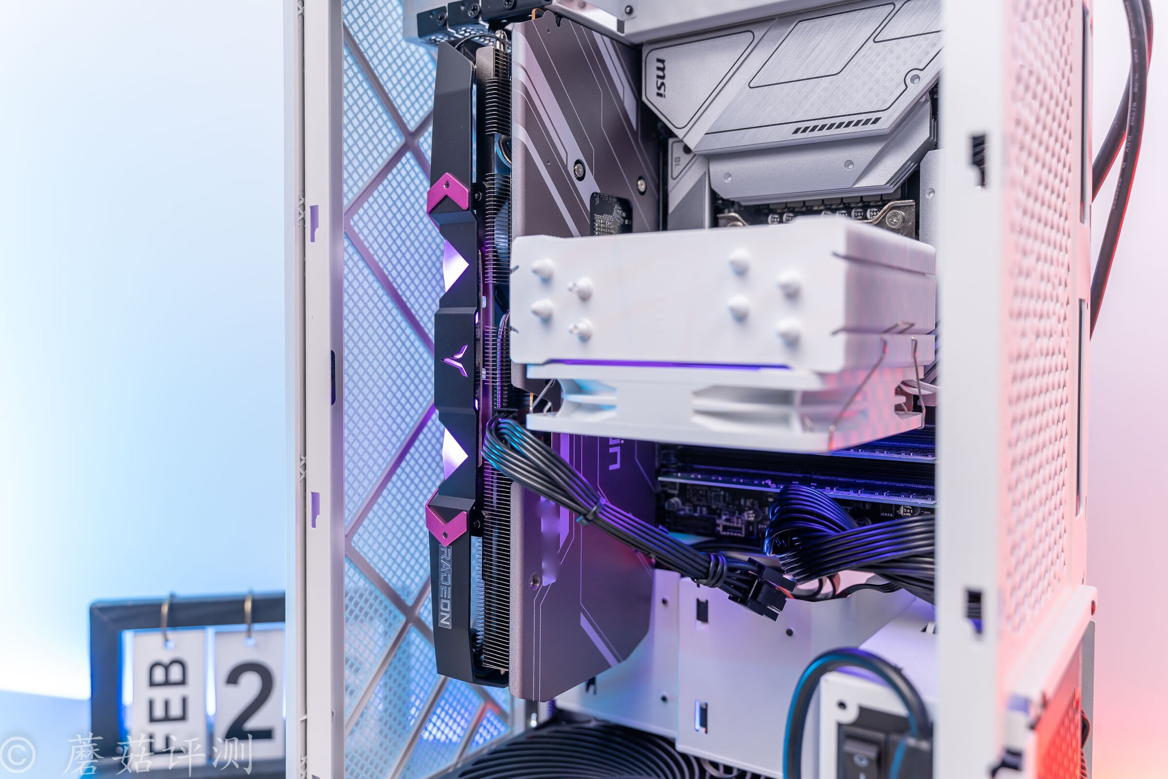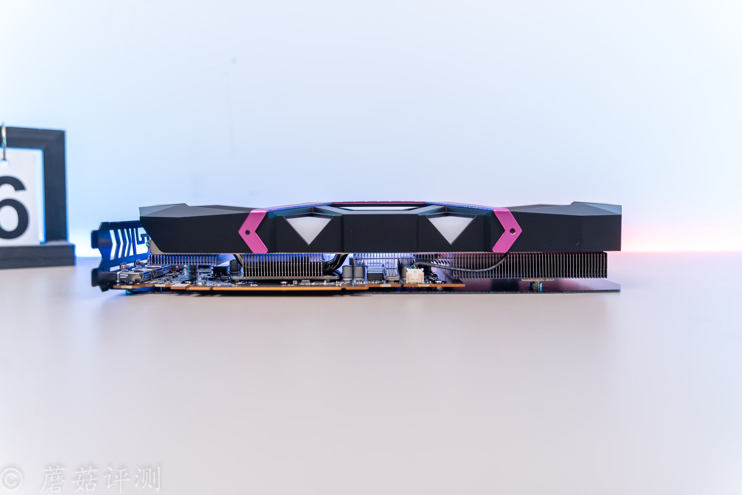▼显卡的上下两侧均有漂亮的灯效设计,紫色和显卡中间的金属件非常搭配。