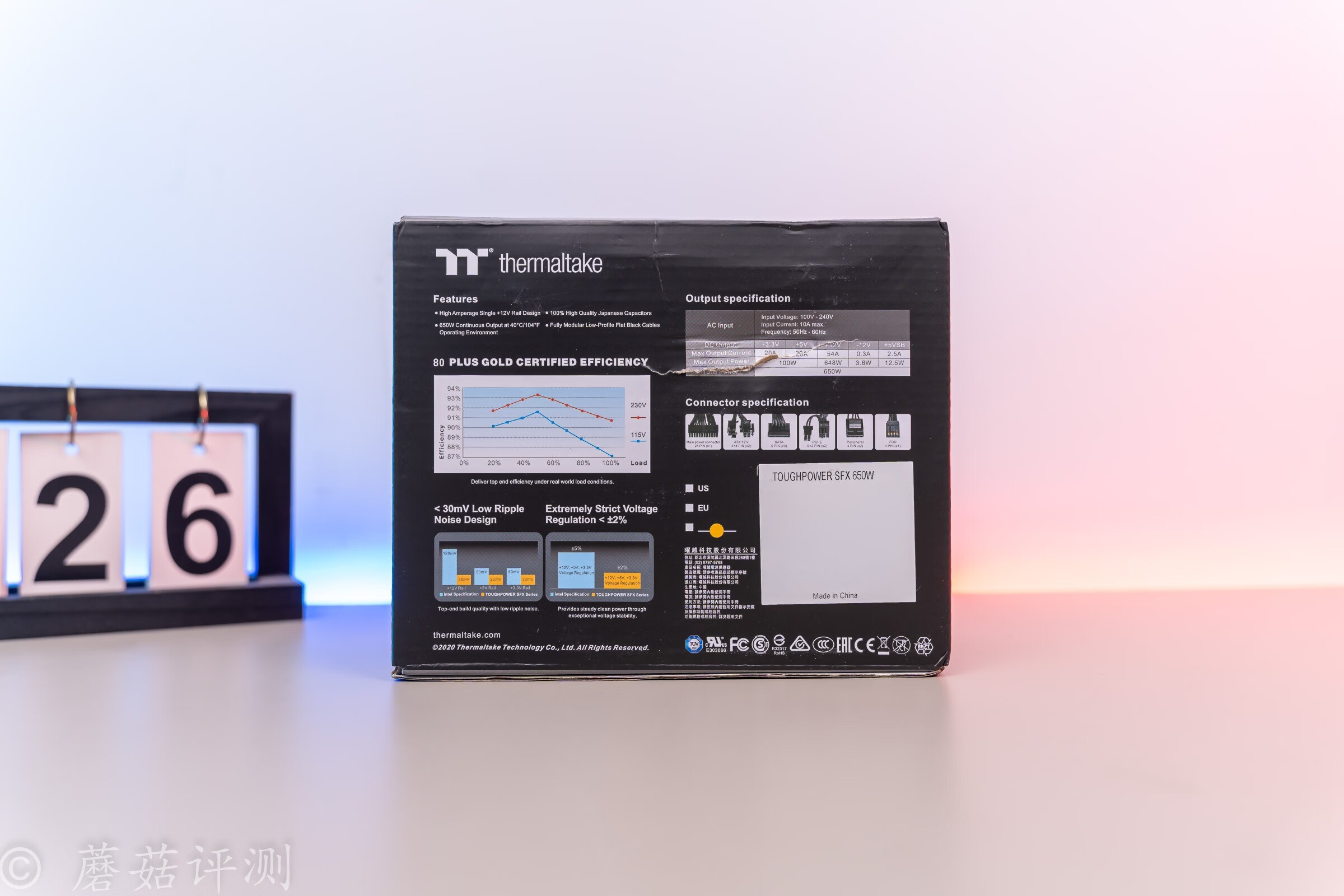 ▼电源纸箱的背面详细介绍了电源的参数,包括转化率、电压偏移、输出参数和模组线配置等信息。