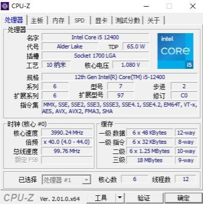 ▼处理器是12400,拥有6个大核,12个线程,三级缓存18MB。