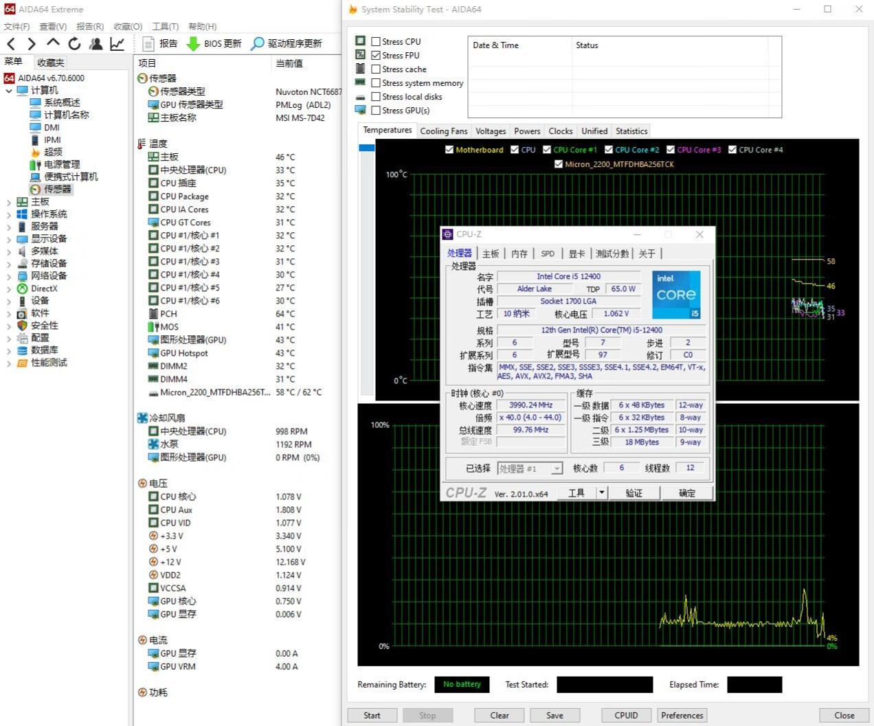 ▼处理器散热测试,日常待机情况,室温24℃左右,处理器的温度在33℃左右,主板南桥64℃、显卡核心43℃、固态58℃。