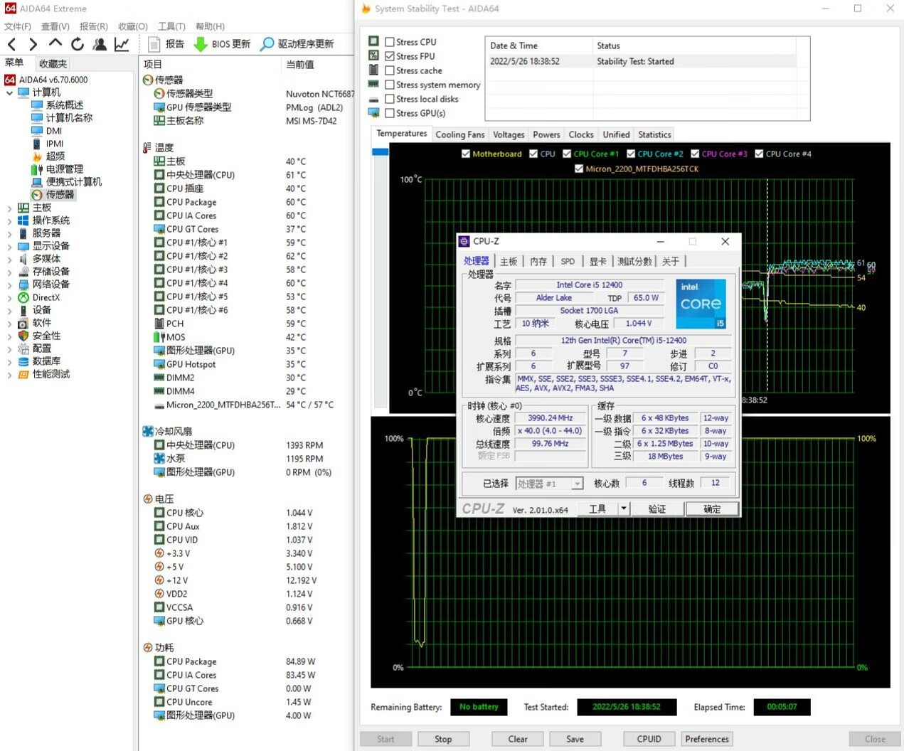 ▼单烤FPU测试,处理器功耗在85W左右,全核心睿频4.0GHz,处理器温度61℃。主板南桥59℃、显卡核心35℃、固态54℃,整体的温度表现也还不错。
