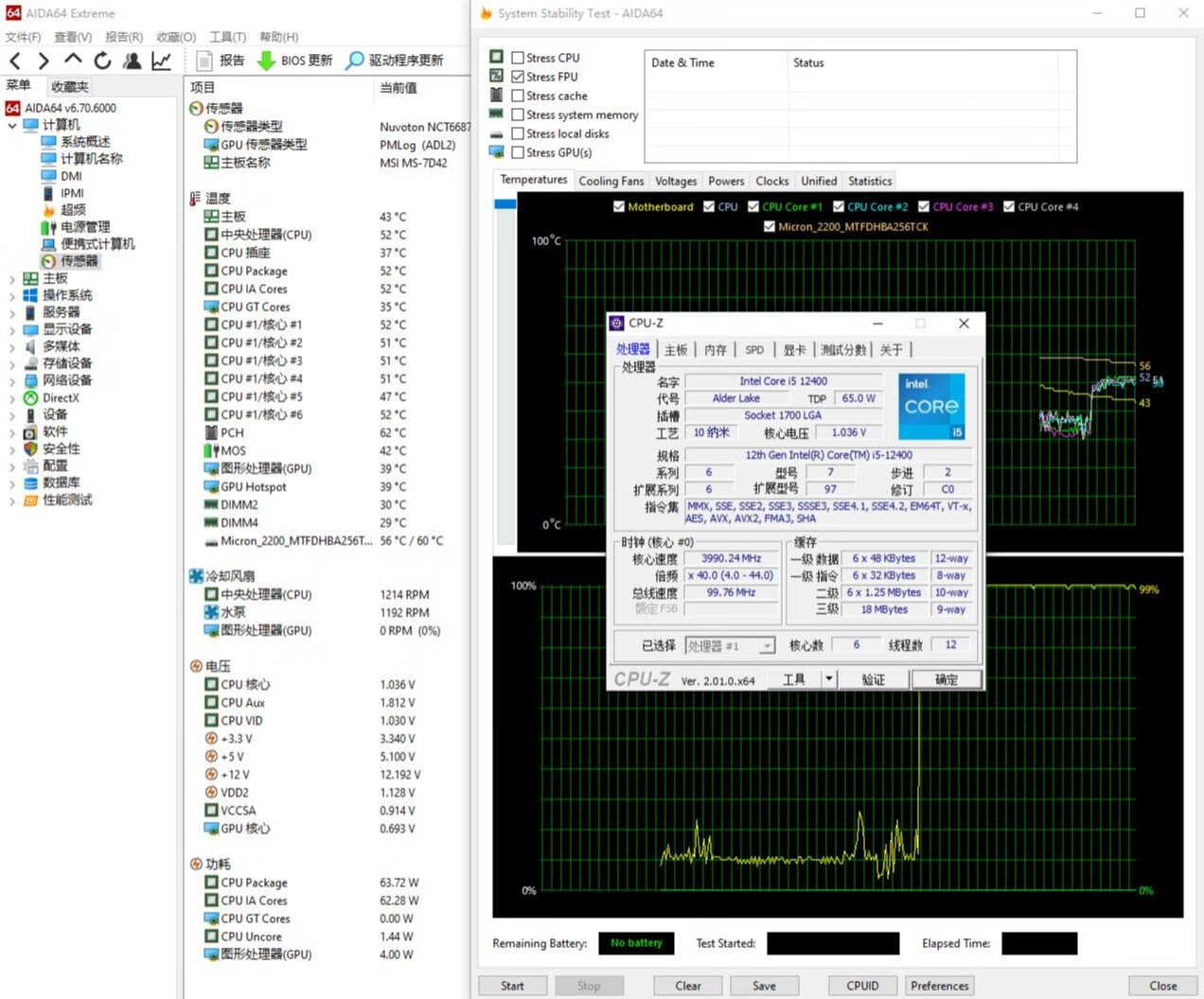 ▼简单跑个CPU-Z的压力测试,处理器的功耗在65W左右,全核心睿频4GHz,处理器温度52℃。主板南桥62℃、显卡核心39℃、固态56℃,机箱的内部风道表现还是挺不错的。