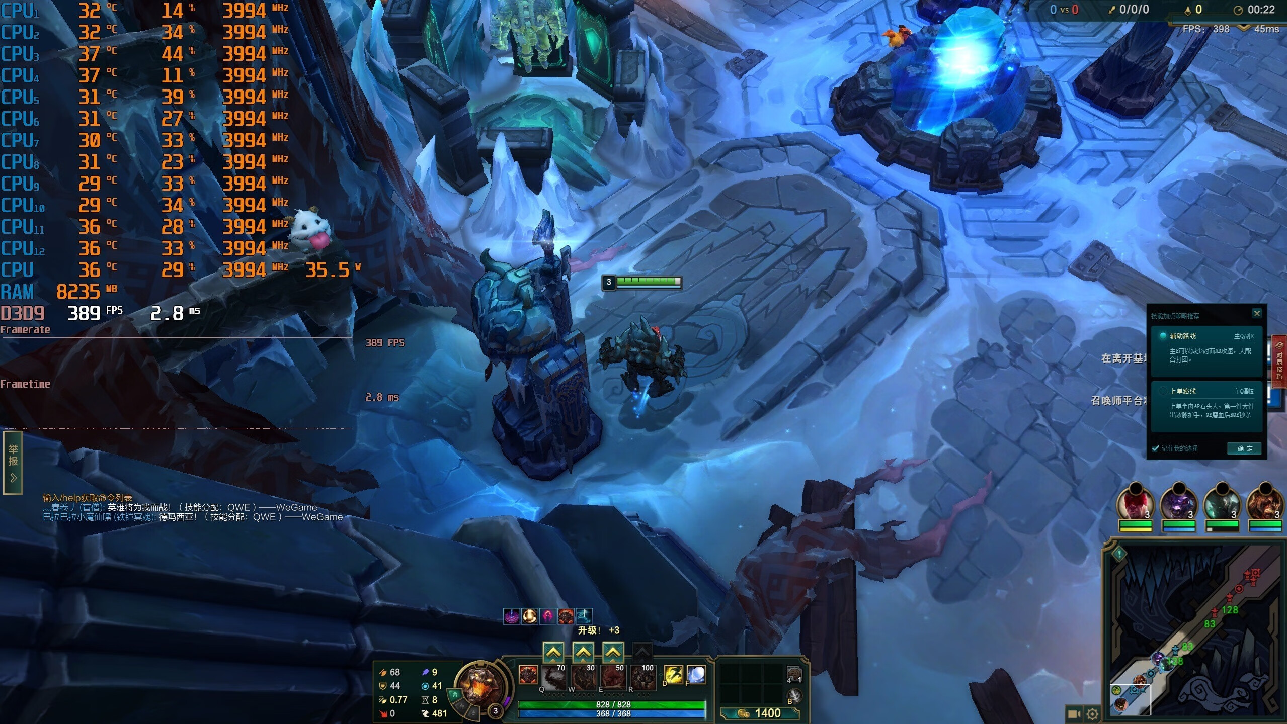 ▼游戏实测,2K分辨率,全极高画质,泉水的游戏帧数在389帧左右,非常流畅。