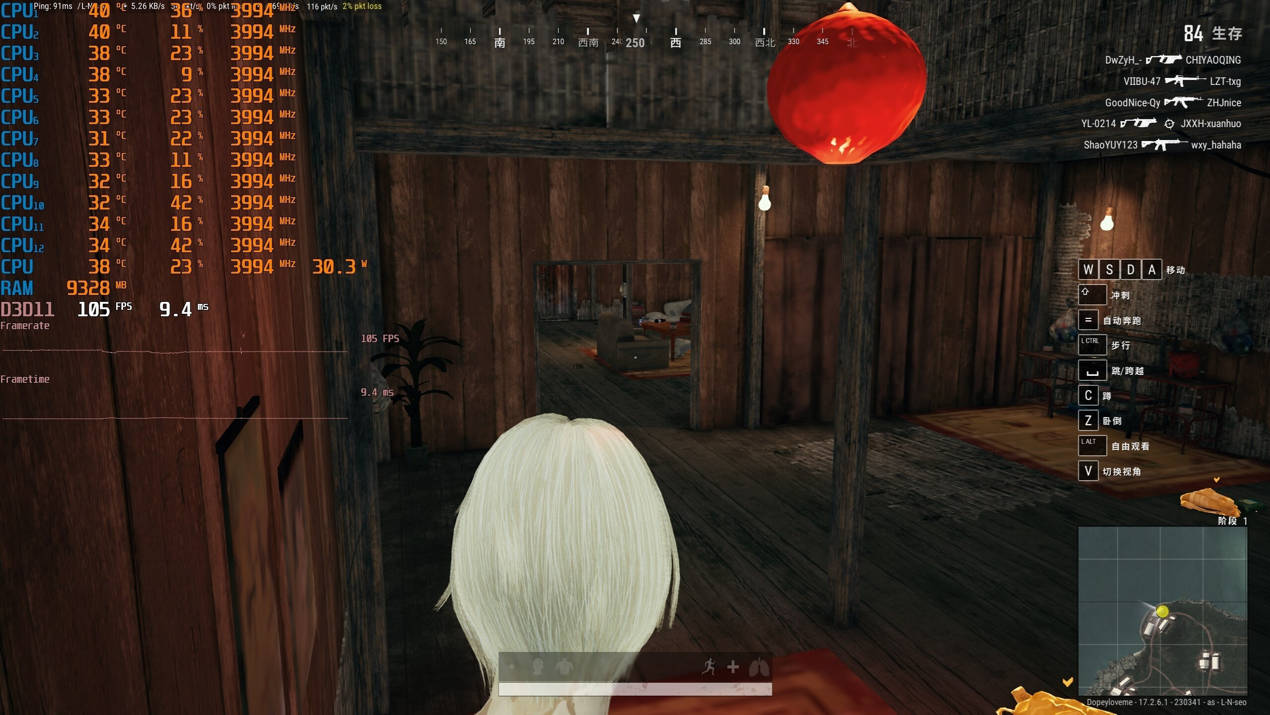 ▼室内的游戏帧数,在105帧足有,也是挺流畅的。最后蘑菇玩到了决赛圈,游戏帧数也能保持在100帧上下,没啥问题。