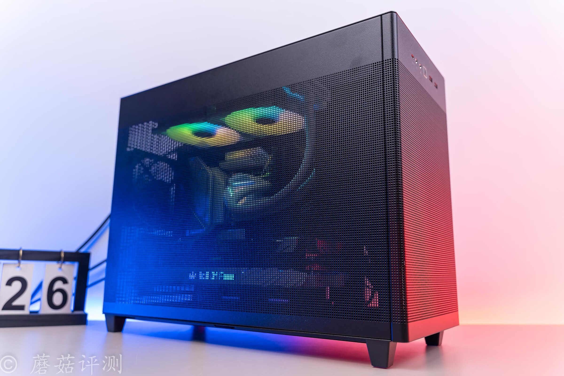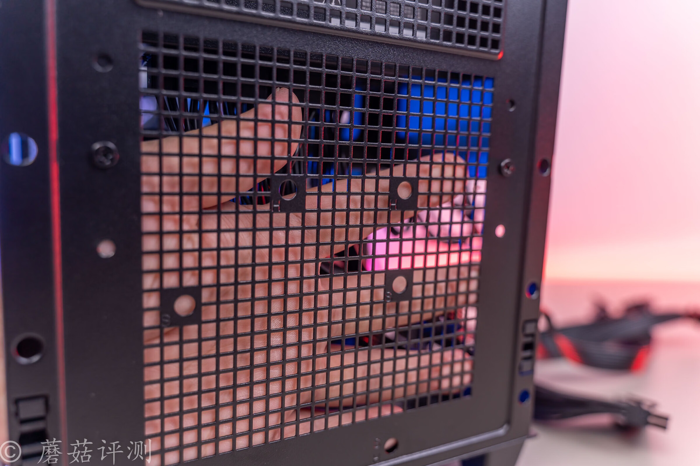 ▼机箱侧面有大面积的金属冲孔网设计,稍微远一些看过去,有种侧透的感觉,质感很棒。