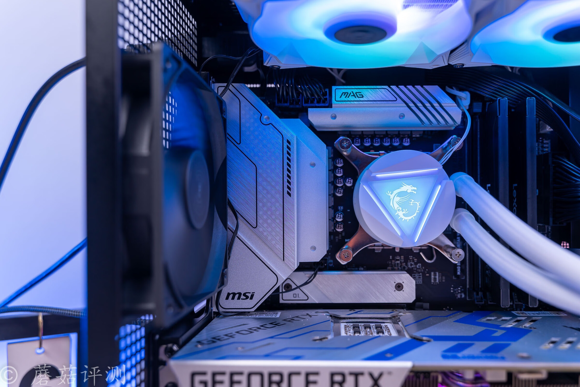 ▼这里使用的处理器是12700K,水冷用的是微星的寒冰240R白色定制版水冷,水冷的颜值非常漂亮。水冷头的中间部分有三角形的设计,在三角形的中间,是微星标志性的魔龙LOGO,细节拉满。再辅以漂亮的ARGB灯效,整体的颜值很在线。