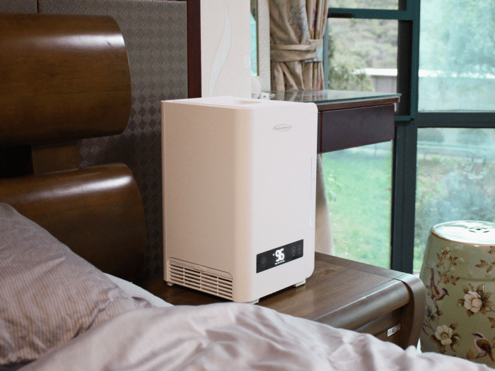 放在床头就挺好的,小小一个不占地方,白天加湿,晚上噪音也很小,完全可以安眠。