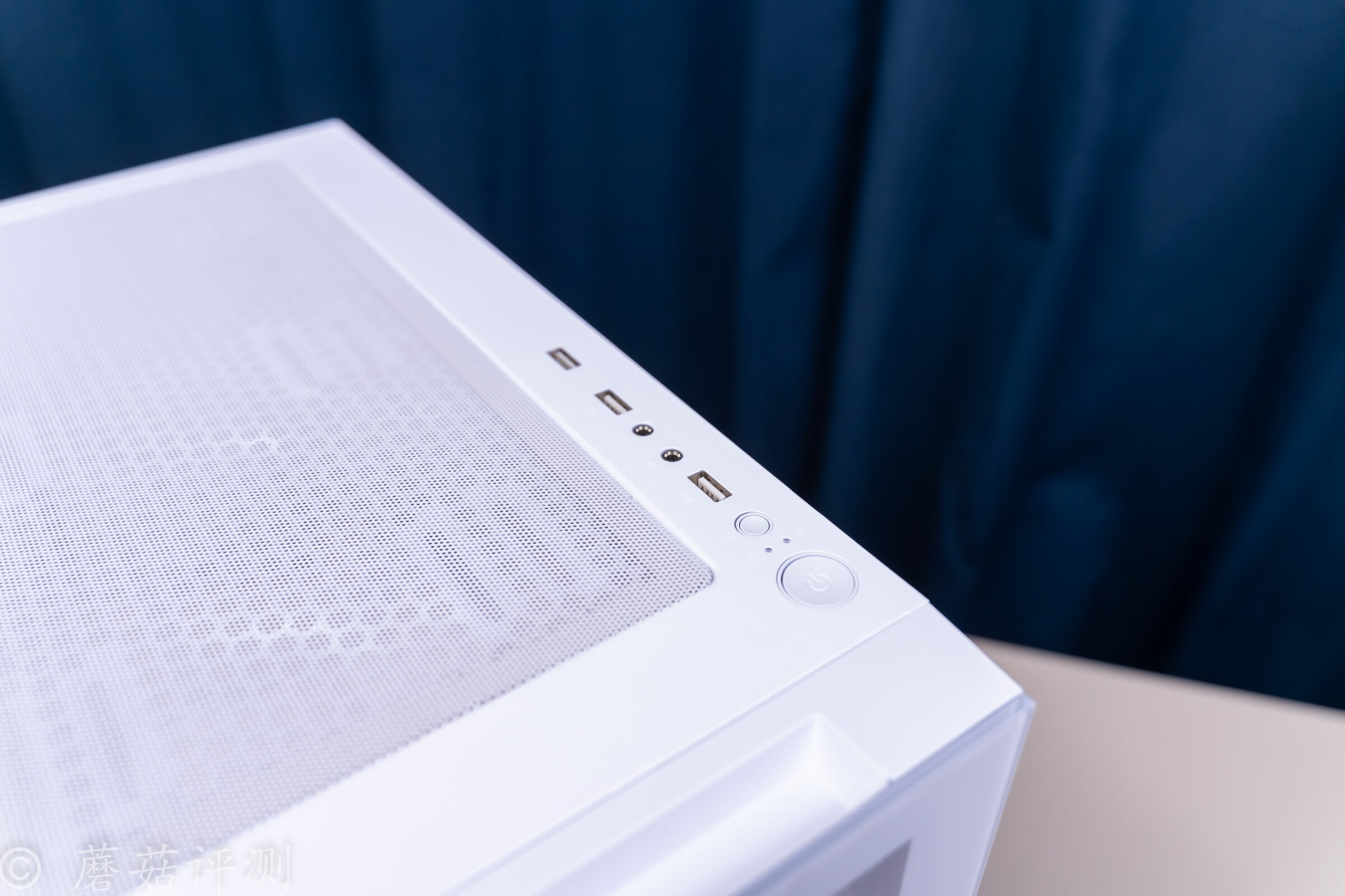 ▼机箱的IO面板放在了机箱的顶部,有开机键、重启键、音频接口、USB2.0接口和USB3.0接口。