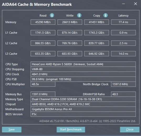 ▼简单跑个读写测试,内存读取45200MB/s、写入26600MB/s、复制41500MB/s,延迟77.4ns。