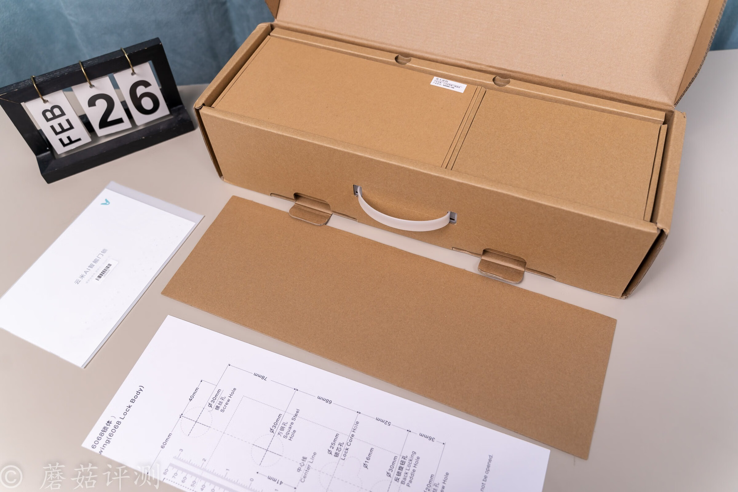▼门锁的包装盒挺小巧的,中间是云米的LOGO,左下角有指纹锁的型号。