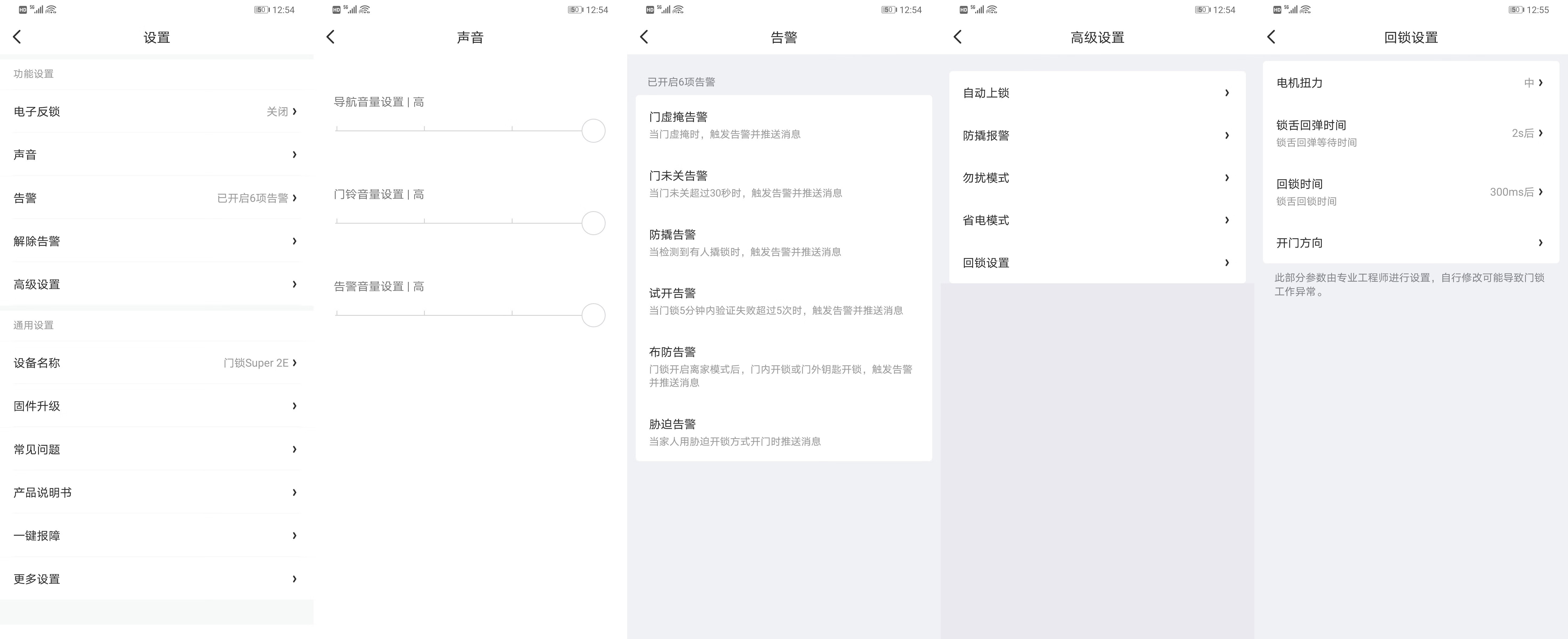 ▼门锁的高级设置方面,还是有很多内容的。首先门锁部分,可以设置扭力、回弹时间、回锁时间等等,可以根据个人的开门习惯进行细致的优化。不过对于普通用户来说,这里最好不要动,采用默认设置就好。除此之外,还可以设置警告、音量之类的。对了,日常使用最好开启省电模式,可以有效的延长一次充电的门锁使用时间。