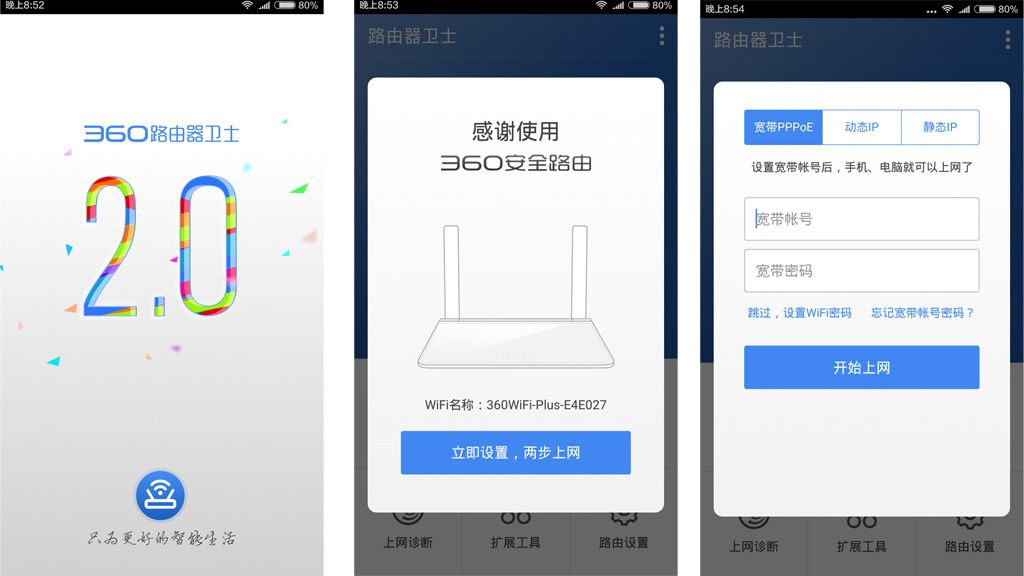 只需包装盒上的二维码下载360路由卫士APP,只需设置两步就能上网,轻松方便。