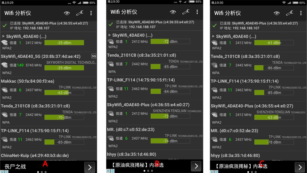 ▲实际测试信号相当不错,可以在厨房实现多款智能设备上网,而信号也仅为-61db,-72db来说,已经可以流畅地观看在线视频与浏览网页了。