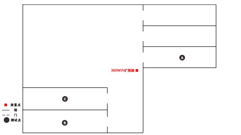 笔者测试房子有80平米接入广东电信12M宽带,笔者在房间的信号都很好,但在厨房与厕所(即B与C放置点)存在信号覆盖盲点,特意将360 WiFi扩展器放在客厅里测试一番。