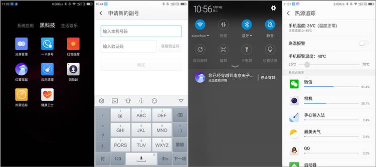360 OS集成了丰富多彩的特色黑科技,让其拓展性能和实用性大大增强。“黑科技”菜单中包括:分身管理,支持微信双开;一卡多号,提供移动副号,使得一张sim卡,多个号码;位置穿越,坐在家里可以穿越到任何地方;热源追踪,查看手机发热来源,一键降温,轻松给手机降温。另外还有红包提醒、应用清理、测脸龄、健康卫士等功能。