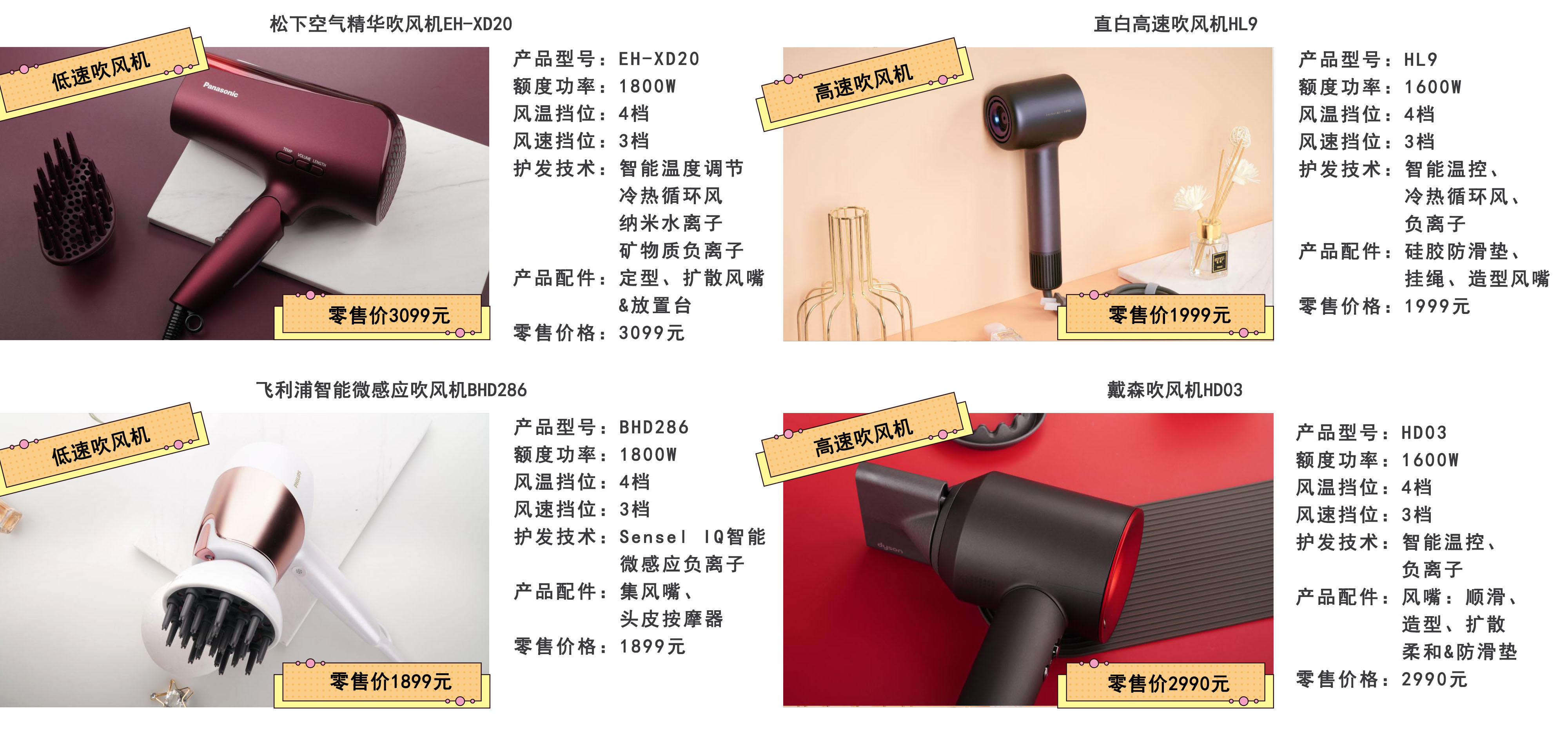 *高速吹风机采用无刷数码马达,转速一般在10-15万转/分,低速吹风机采用有刷普通马达,转速一般在1-2万转/分。 【测评产品】小智选择了四款高端且有代表性的吹风机,价格从1000多到3000元不等: