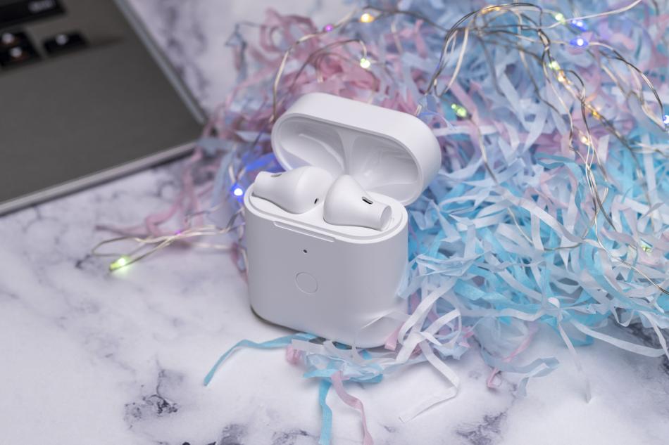 耳机盒外观采用纯白色配色,简约干净。正面是指示灯和圆形的复位按键。
