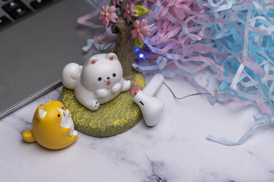 侧面看起来是圆润的外形,耳机采用半入耳方式,贴合耳部轮廓,佩戴起来感觉非常舒适稳固,人体工学设计很成功。