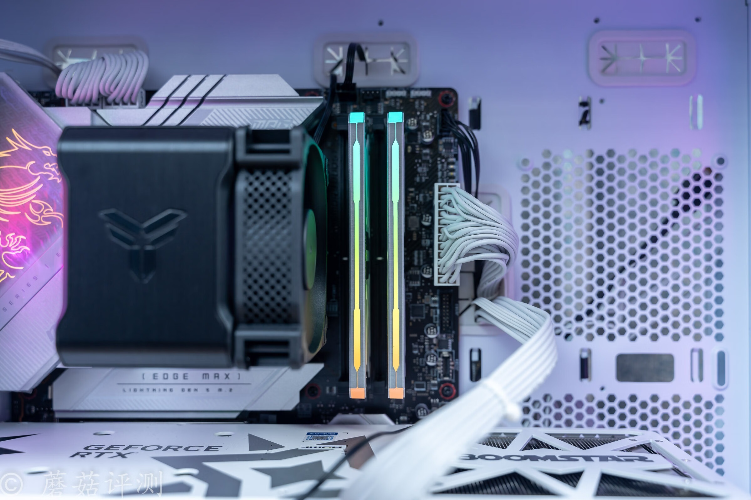 ▼靠近看看,内存条侧面的RGB灯带效果也很不错,灯效同样十分细腻。
