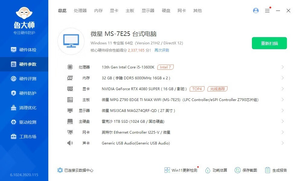 ▼整机配置一览,处理器是13600K,主板是微星的Z790刀锋MAX,显卡是影驰的RTX4080 Super星曜OC。