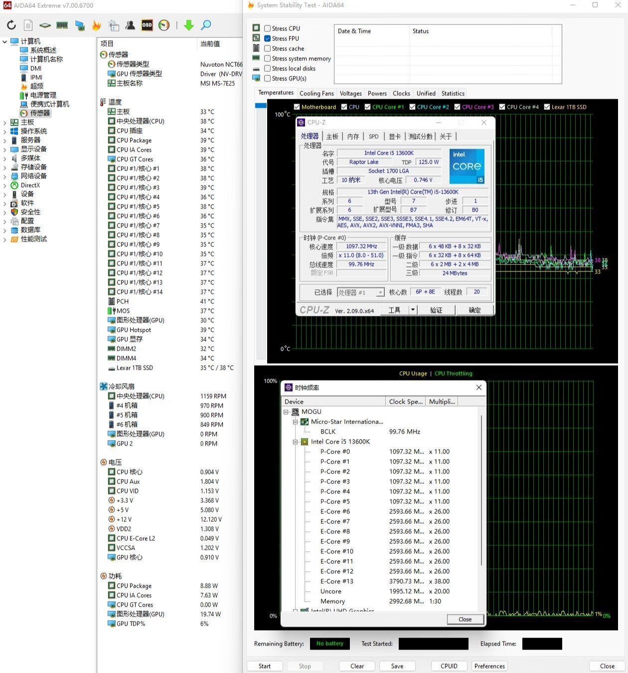 ▼日常待机情况,室温在22℃左右,处理器温度在38℃左右波动,散热表现不错。