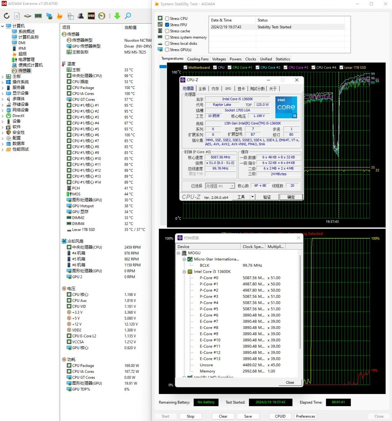 ▼默认情况下,单烤FPU测试,处理器功耗在170W左右,处理器温度阶梯式飙升至99℃,降频,压不住。