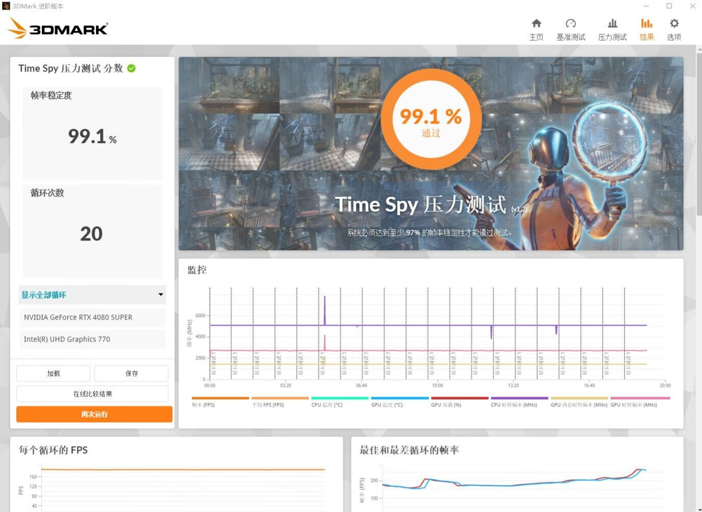 ▼最后跑个3Dmark的压力测试,TS模式,帧数稳定率在99.1%,非常稳定。