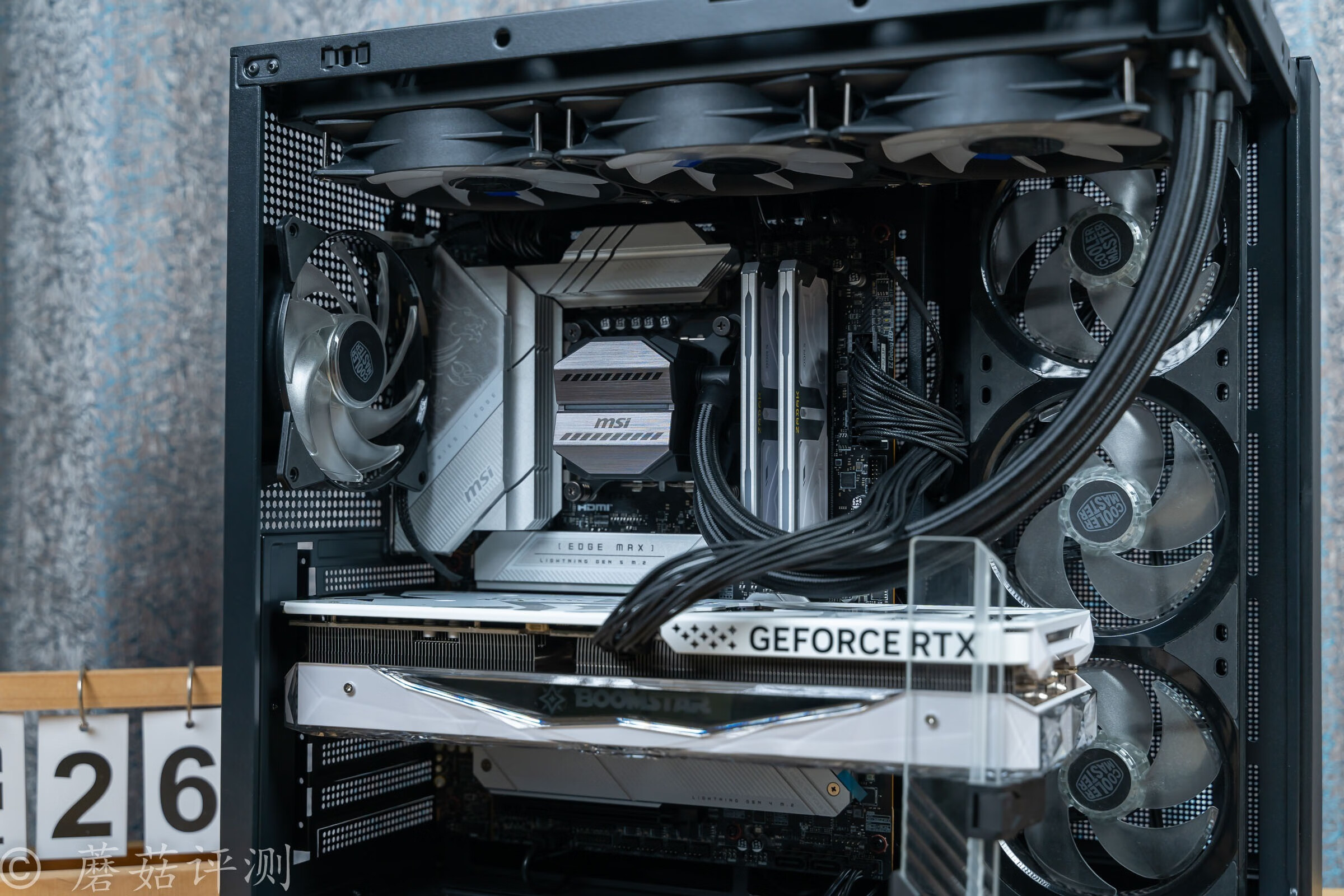 ▼主板轻松固定到机箱的左侧,360水冷排安装到机箱的顶部,水冷排和主板之间,还有不少的空间。