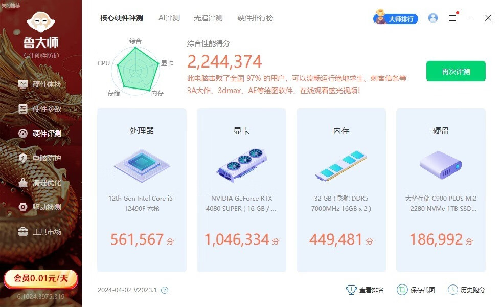 ▼简单跑个测试,整机得分224W,其中处理器单独得分56.1W,显卡单独得分104.6W,分数都很高。