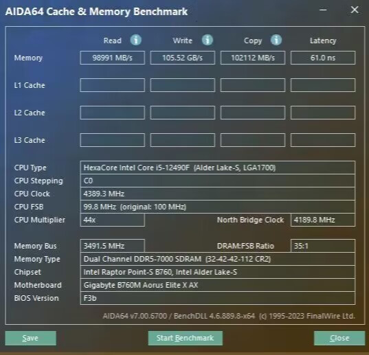 ▼简单跑下内存的读写测试,成绩非常优秀,内存读取速度98991MB/s、写入速度105.52GB/s、复制102112MB/s,延迟61ns。