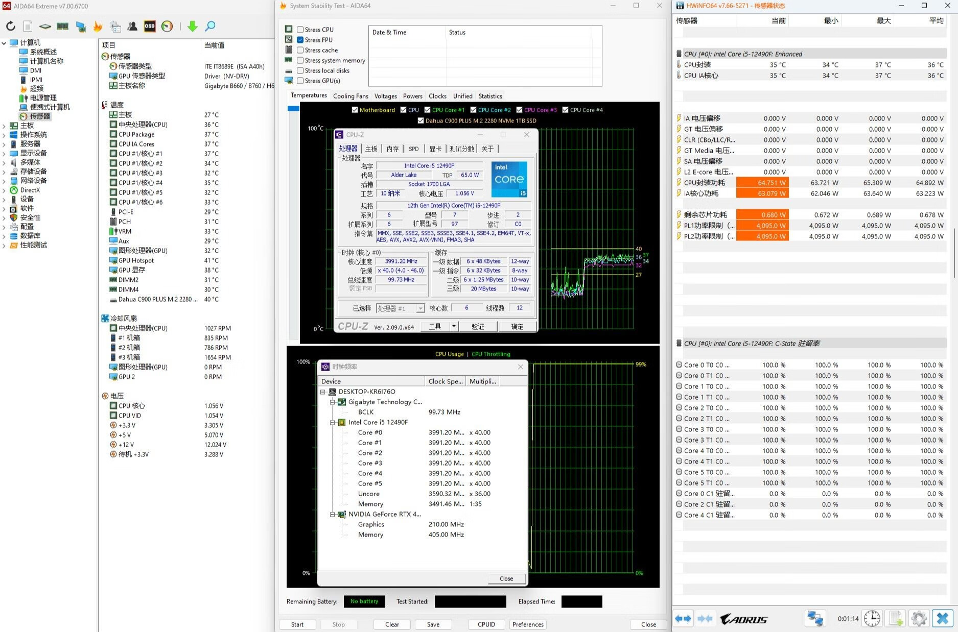 ▼日常待机情况,室温在20℃左右,处理器的待机温度极低,仅有19℃,就离谱。不过12490F这颗处理器的功耗和发热都不大,这里用360一体式水冷来压只是为了好看,哈哈。
