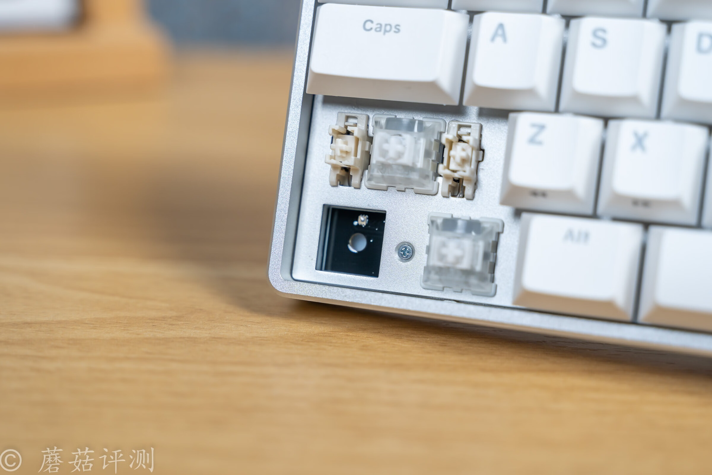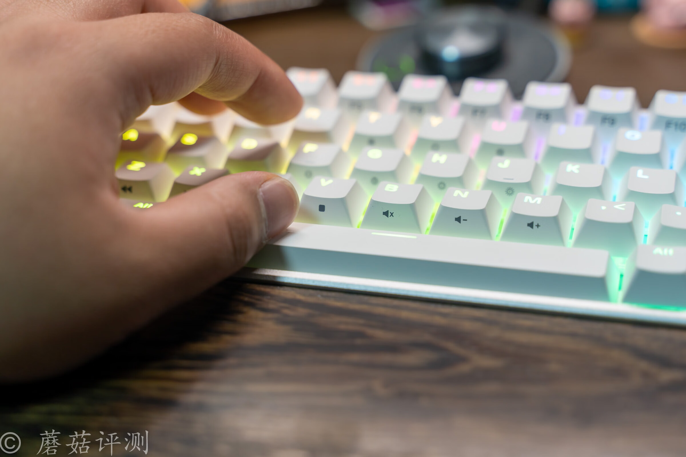 键盘整体的轴体更换、键帽更换也非常的方便,可以根据个人需求进行针对性的调整。瑞翼鲨的这款磁轴有红磁轴和白磁轴两种,白磁轴整体偏硬、键程偏短,蘑菇个人还是更喜欢红磁轴,后期会考虑把轴体部分换成红磁轴,再更换一套薄的、双料注塑的PBT键帽,主要是字母键位和数字键位部分,就完美了。